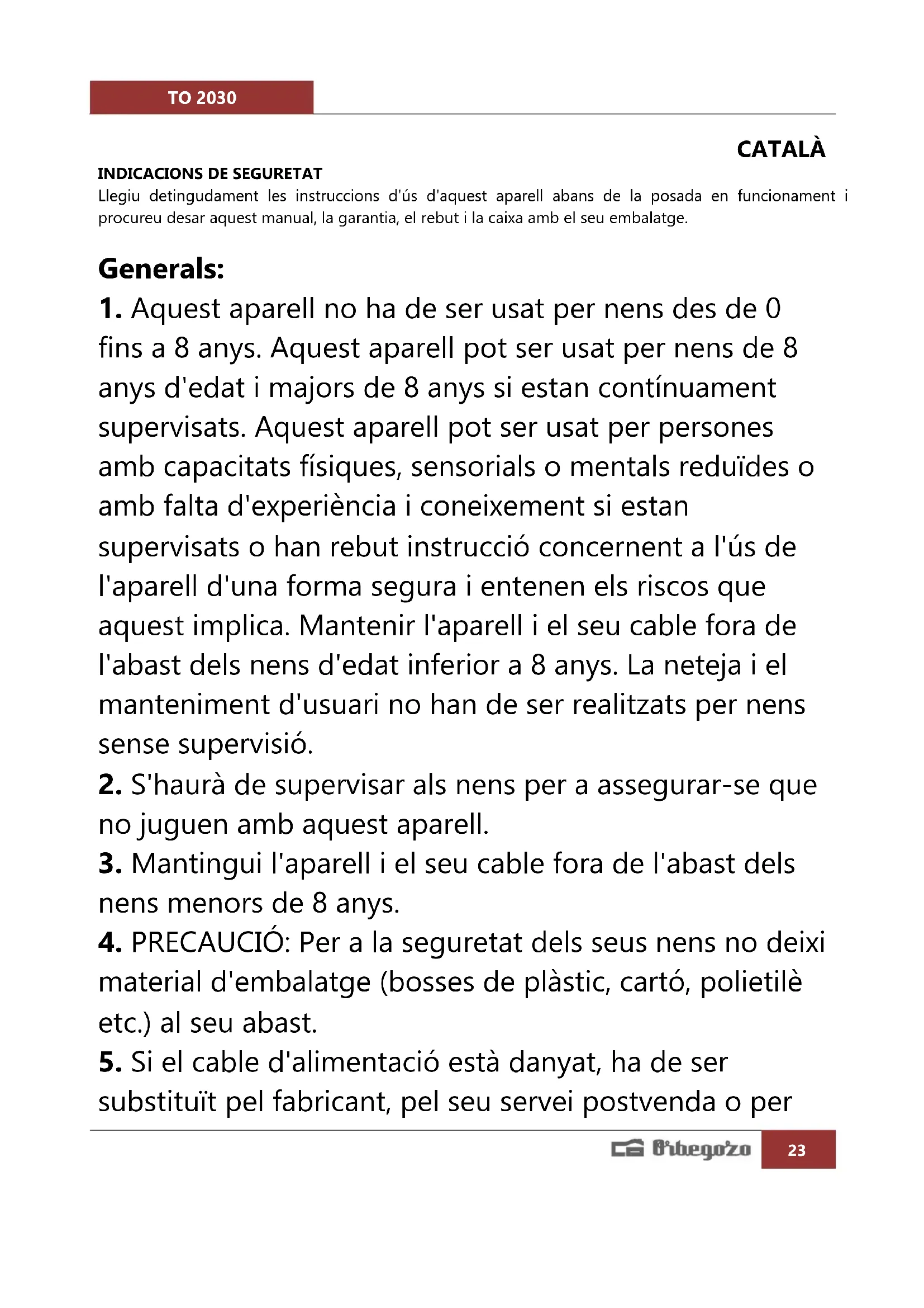 Llegiu aquestes instruccions detingudament. Guardi- les per a referències futures. El torrador no ha de ser utilitzat a prop o sota cortines o altres materials inflamables. No utilitzeu l'aparell a l'aire lliure. No cobriu el torrador amb paper d'alumini o coses similars ni inseriu objectes a través de la reixeta. No col·loqueu objectes estranys sobre la reixeta de torrat. Mantingueu el torrador allunyat de les fonts de calor. No deixeu el cable penjant lliurement, ni permeteu que aquest estigui en contacte amb les superfícies calentes. Mai col·loqueu el torrador de costat quan estigui encès. No utilitzeu el torrador si la safata recollidor de migues no està encaixada correctament. Aquest aparell només ha de ser utilitzat per als propòsits previstos. No deixeu desatès l'aparell en funcionament. Connecteu l'aparell només a un endoll amb presa de terra. El pa pot cremar, de manera que els torradors de pa no s'han d'usar en proximitat o sota materials combustibles, com ara cortines.TO 2030