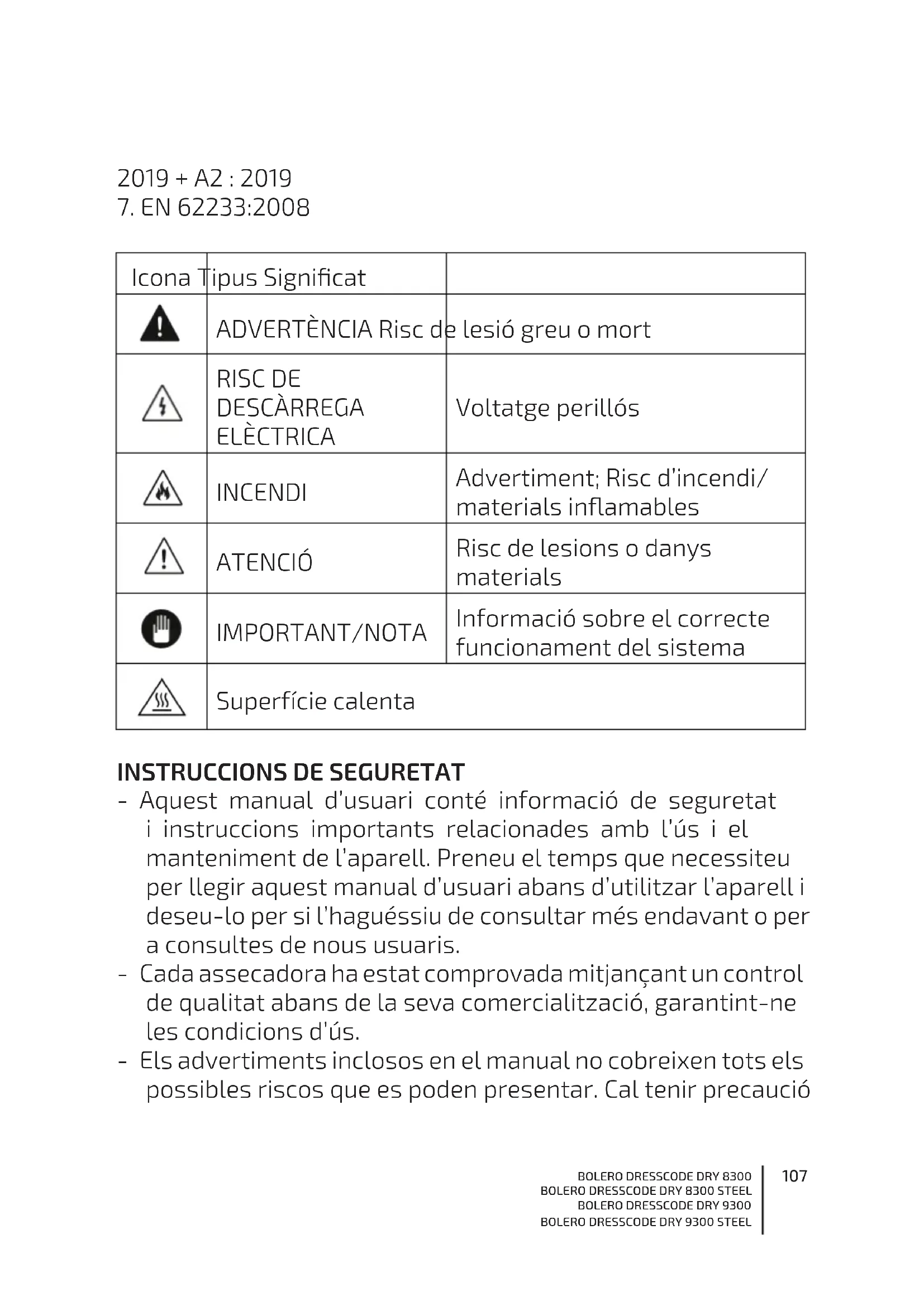 - Aquest manual d’usuari conté informació de seguretat i instruccions importants relacionades amb l’ús i el manteniment de l’aparell. Preneu el temps que necessiteu per llegir aquest manual d’usuari abans d’utilitzar l’aparell i deseu-lo per si l’haguéssiu de consultar més endavant o per a consultes de nous usuaris. - Cada assecadora ha estat comprovada mitjançant un control de qualitat abans de la seva comercialització, garantint-ne les condicions d’ús. - Els advertiments inclosos en el manual no cobreixen tots els possibles riscos que es poden presentar. Cal tenir precaució108