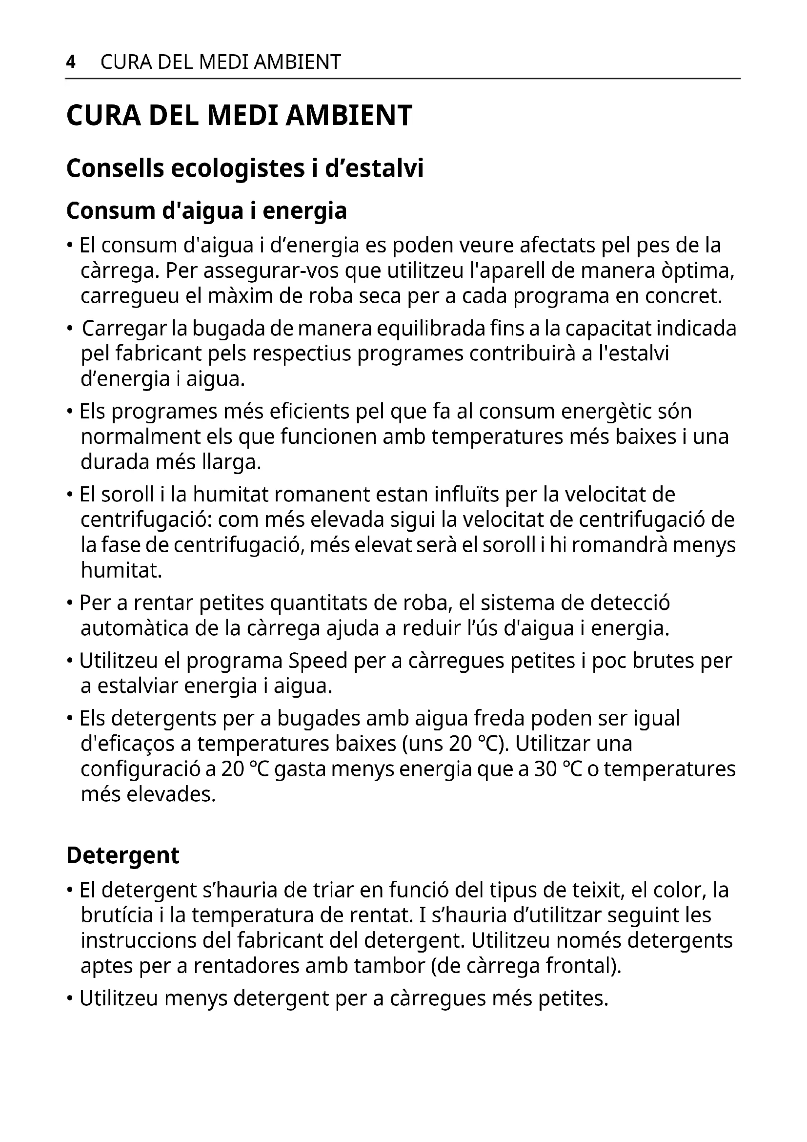 - El detergent s’hauria de triar en funció del tipus de teixit, el color, la brutícia i la temperatura de rentat. I s’hauria d’utilitzar seguint les instruccions del fabricant del detergent. Utilitzeu només detergents aptes per a rentadores amb tambor (de càrrega frontal).