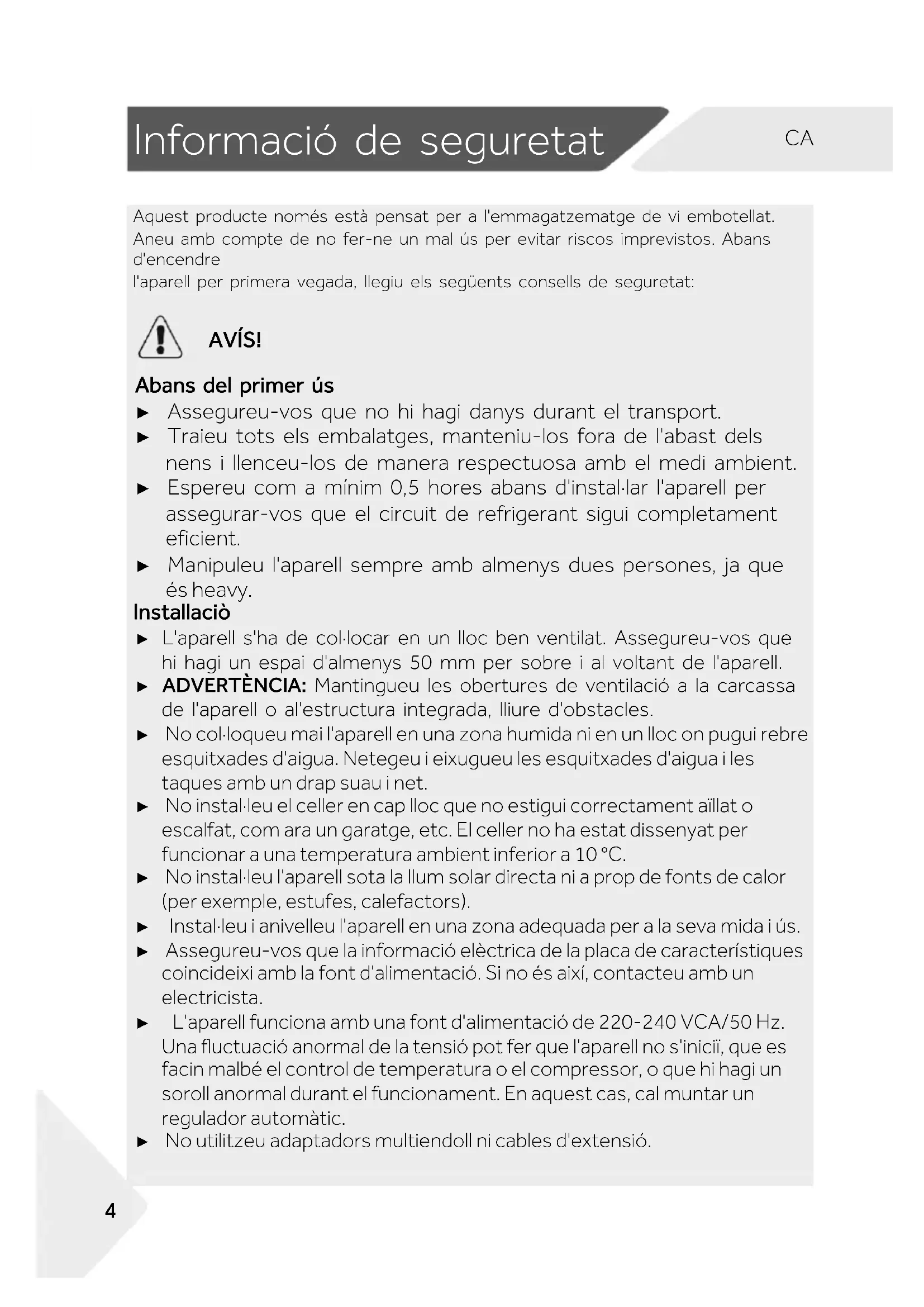 Aquest producte només està pensat per a l'emmagatzematge de vi embotellat. Aneu amb compte de no fer-ne un mal ús per evitar riscos imprevistos. Abans d'encendre l'aparell per primera vegada, llegiu els següents consells de seguretat: AVÍS! Abans del primer ús ► Assegureu-vos que no hi hagi danys durant el transport. ► Traieu tots els embalatges, manteniu-los fora de l'abast dels nens i llenceu-los de manera respectuosa amb el medi ambient. ► Espereu com a mínim 0,5 hores abans d'instal·lar l'aparell per assegurar-vos que el circuit de refrigerant sigui completament eficient. ► Manipuleu l'aparell sempre amb almenys dues persones, ja que és heavy. Installaciò ► L'aparell s'ha de col·locar en un lloc ben ventilat. Assegureu-vos que hi hagi un espai d'almenys 50 mm per sobre i al voltant de l'aparell. ► ADVERTÈNCIA: Mantingueu les obertures de ventilació a la carcassa de l'aparell o al'estructura integrada, lliure d'obstacles. ► No col·loqueu mai l'aparell en una zona humida ni en un lloc on pugui rebre esquitxades d'aigua. Netegeu i eixugueu les esquitxades d'aigua i les taques amb un drap suau i net. ► No instal·leu el celler en cap lloc que no estigui correctament aïllat o escalfat, com ara un garatge, etc. El celler no ha estat dissenyat per funcionar a una temperatura ambient inferior a 10 °C. ► No instal·leu l'aparell sota la llum solar directa ni a prop de fonts de calor (per exemple, estufes, calefactors). ► Instal·leu i anivelleu l'aparell en una zona adequada per a la seva mida i ús.► Assegureu-vos que la informació elèctrica de la placa de característiques coincideixi amb la font d'alimentació. Si no és així, contacteu amb un electricista. ► L'aparell funciona amb una font d'alimentació de 220-240 VCA/50 Hz. Una fluctuació anormal de la tensió pot fer que l'aparell no s'iniciï, que es facin malbé el control de temperatura o el compressor, o que hi hagi un soroll anormal durant el funcionament. En aquest cas, cal muntar un regulador automàtic. ► No utilitzeu adaptadors multiendoll ni cables d'extensió.Informació de seguretat