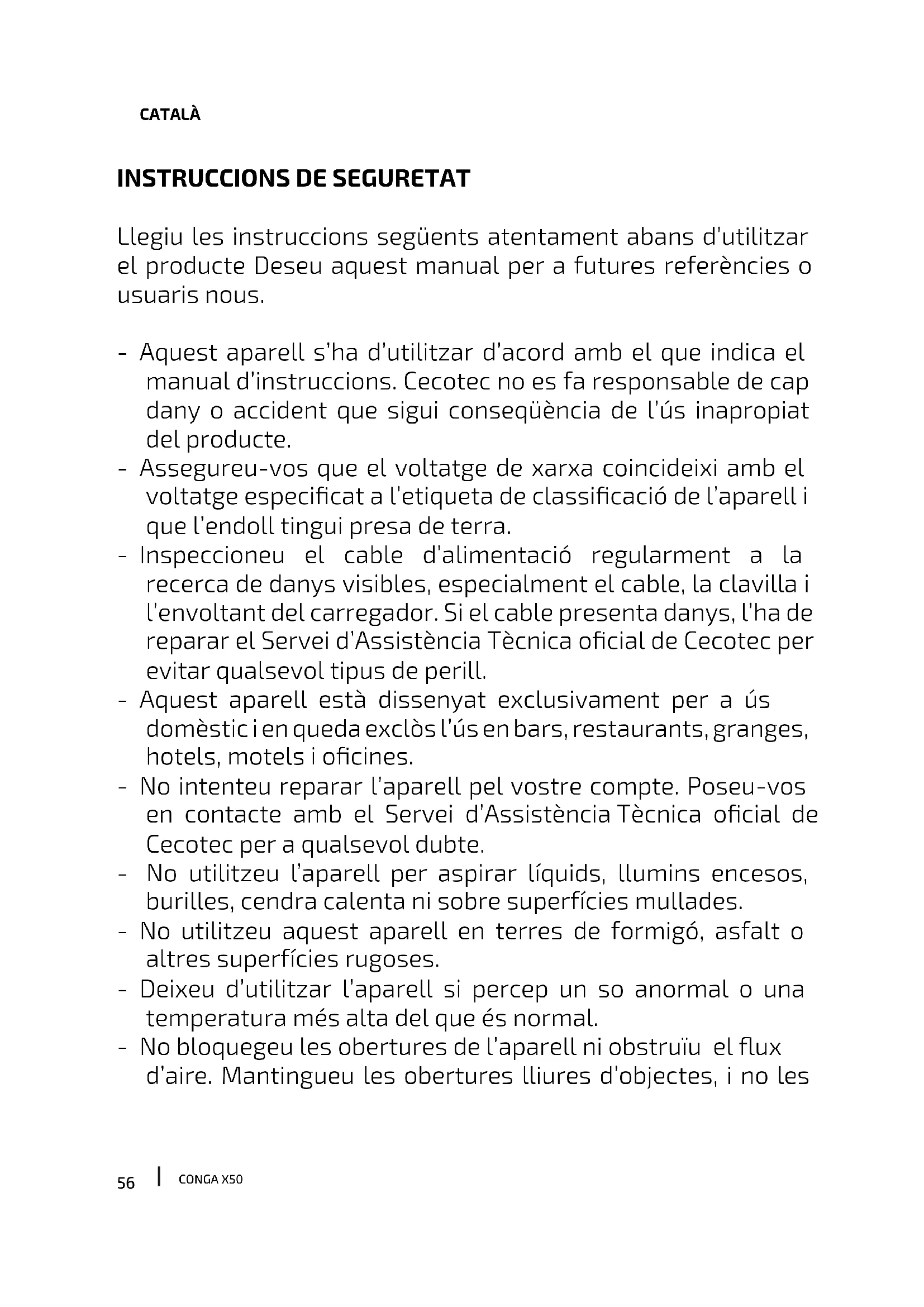 Llegiu les instruccions següents atentament abans d’utilitzar el producte Deseu aquest manual per a futures referències o usuaris nous. - Aquest aparell s’ha d’utilitzar d’acord amb el que indica el manual d’instruccions. Cecotec no es fa responsable de cap dany o accident que sigui conseqüència de l’ús inapropiat del producte. - Assegureu-vos que el voltatge de xarxa coincideixi amb el voltatge especicat a l’etiqueta de classicació de l’aparell i que l’endoll tingui presa de terra. - Inspeccioneu el cable d’alimentació regularment a la recerca de danys visibles, especialment el cable, la clavilla i l’envoltant del carregador. Si el cable presenta danys, l’ha de reparar el Servei d’Assistència Tècnica ocial de Cecotec per evitar qualsevol tipus de perill. - Aquest aparell està dissenyat exclusivament per a ús domèstic i en queda exclòs l’ús en bars, restaurants, granges, hotels, motels i ocines. - No intenteu reparar l’aparell pel vostre compte. Poseu-vos en contacte amb el Servei d’Assistència Tècnica ocial de Cecotec per a qualsevol dubte. - No utilitzeu l’aparell per aspirar líquids, llumins encesos, burilles, cendra calenta ni sobre superfícies mullades. - No utilitzeu aquest aparell en terres de formigó, asfalt o altres superfícies rugoses. - Deixeu d’utilitzar l’aparell si percep un so anormal o una temperatura més alta del que és normal. - No bloquegeu les obertures de l’aparell ni obstruïu el ux d’aire. Mantingueu les obertures lliures d’objectes, i no les57 CONGA X50 CATALÀ tapeu amb roba o els dits. - Apagueu i desendolleu l’aparell de la font d’alimentació quan no s’utilitzi per un temps, abans de netejar-lo, abans de muntar o desmuntar els components i abans de retirar la bateria. Tireu l’endoll per desconnectar-lo, no estireu el cable. - ADVERTIMENT: aquest aparell té parts rotatòries que poden comportar risc d’atrapament. Extremeu les precaucions. - No submergiu el cable, l’endoll o qualsevol altra part de l’aparell en aigua o qualsevol altre líquid, ni exposeu les connexions elèctriques a l’aigua. Assegureu-vos que teniu les mans completament seques abans de tocar l’endoll o engegar l’aparell. - Aquest aparell el poden utilitzar nens amb edat de 8 anys i superior i persones amb capacitats físiques, sensorials o mentals reduïdes o manca dexperiència i coneixement, si sels ha donat la supervisió o formació apropiades respecte a lús de laparell duna manera segura i comprenen els perills que implica. Els nens no han de jugar amb laparell. La neteja i el manteniment per a l’usuari no els han de fer els nens sense supervisió. - No toqueu el cable ni la presa de corrent amb les mans mullades. - No exposeu l’aparell a llum solar directa, foc, aigua o humitat. - No se sent ni col·loqueu objectes esmolats o pesats damunt de l’aparell. - Abans de posar en funcionament el robot aspirador, prepareu l’habitació i aneu amb compte constant, retireu els objectes i cables que puguin afectar el seu funcionament. - Mantingueu l’aparell allunyat de peces de roba, cortines i materials similars. - Col·loqueu l’aparell en una superfície plana i estable. Eviteu58 CONGA X50 CATALÀ col·locar-lo en llocs inestables on hi hagi risc de caiguda (com taules o cadires). - Abans de posar-ho en funcionament, comproveu que totes les connexions, tant les del robot aspirador com les de la base de càrrega, estan en bon estat. - Eviteu posar el robot aspirador en funcionament sota temperatures extremadament altes o baixes. - L’aparell només s’ha d’usar amb la bateria i la base de càrrega subministrades amb ell o amb unitats compatibles aprovades per Cecotec . - Assegureu-vos que l’aparell no està connectat a una presa de corrent abans de dur a terme la neteja de l’aparell o de fer-ne el manteniment. - Assegureu-vos que la base de càrrega no està connectada a una presa de corrent abans de netejar-la. Instruccions de la bateria - L’aparell inclou una bateria d’ion-liti, no la cremeu ni l’exposeu a temperatures altes, ja que podria explotar. - Les bateries poden presentar fugides en condicions extremes. Si les bateries degoten, no toqueu el líquid. Si el líquid entra en contacte amb la pell, renti’s immediatament amb aigua i sabó. Si el líquid entra en contacte amb els ulls, renti’ls de forma immediata amb abundant aigua neta per un mínim de 10 minuts i busqui assistència mèdica. Utilitzeu guants per manejar la bateria o la pila i llenceu-la immediatament d’acord amb la normativa local. - Eviteu el contacte entre bateries i petits objectes metàl·lics com clips, monedes, claus, claus o cargols. - No alteri la bateria de cap manera. - Les bateries han de retirar-se de laparell per a la deixalla de manera segura.59 CONGA X50 CATALÀ - Mantingueu fora de l’abast dels nens bateries que tinguin risc de ser ingerides. - La ingestió de bateries pot provocar cremades, perforació de parts toves i la mort. Poden provocar cremades greus les dues hores següents a la ingesta. - En cas d’ingerir bateries acudiu ràpidament al vostre centre mèdic més proper. - ADVERTIMENT: per a la recàrrega de la bateria, utilitzeu només l’estació de càrrega subministrada amb l’aparell. - Les bateries no recarregables no han de ser recarregades. - Els borns dalimentació de les bateries no han de ser curtcircuitats. - Si laparell serà emmagatzemat un llarg període de temps és convenient retirar la bateria. - Aquest aparell conté bateries que només poden ser reemplaçades per persones qualicades. - Les bateries han de ser inserides a la posició correcta. Fixeu- vos en la polaritat a l’hora de reemplaçar-les. RECICLATGE D’APARELLS ELÈCTRICS I ELECTRÒNICS Aquest símbol indica que, d’acord amb les normatives aplicables, el producte i/o la bateria s’han de rebutjar de manera independent dels residus domèstics. Quan aquest producte arribi al nal de la seva vida út
