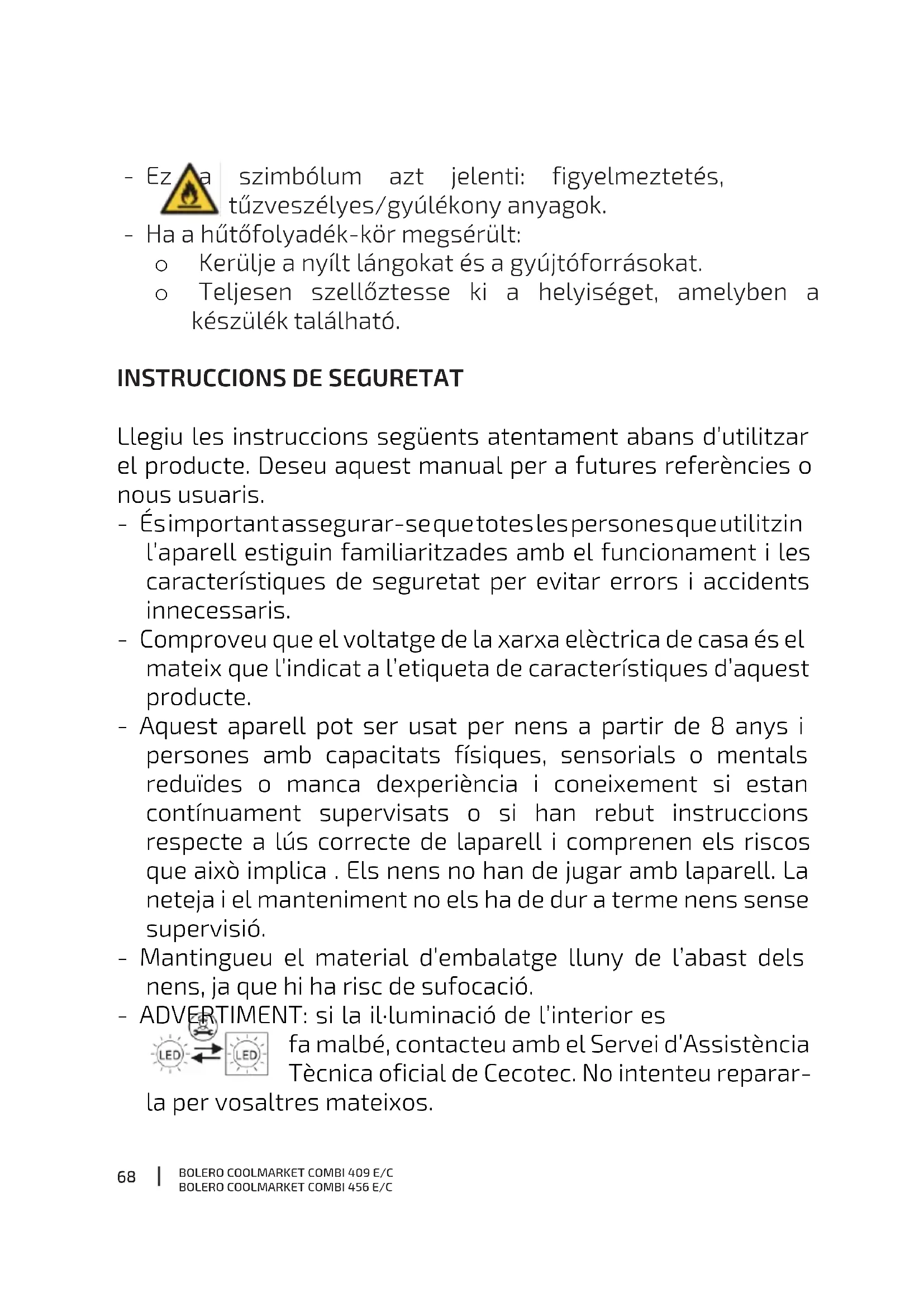 Atenció! Quan netegeu i descongeleu el frigorífic, desendolleu primer el cable d’alimentació. Neteja - Netegeu la pols al voltant del frigorífic per millorar l’efecte de dissipació de la calor i estalviar energia. - L’interior del frigorífic s’ha de netejar sovint per evitar olors desagradables. Utilitzeu un drap suau i humitejat amb aigua i assequi’l amb un drap sec.BOLERO COOLMARKET COMBI 409 E/C