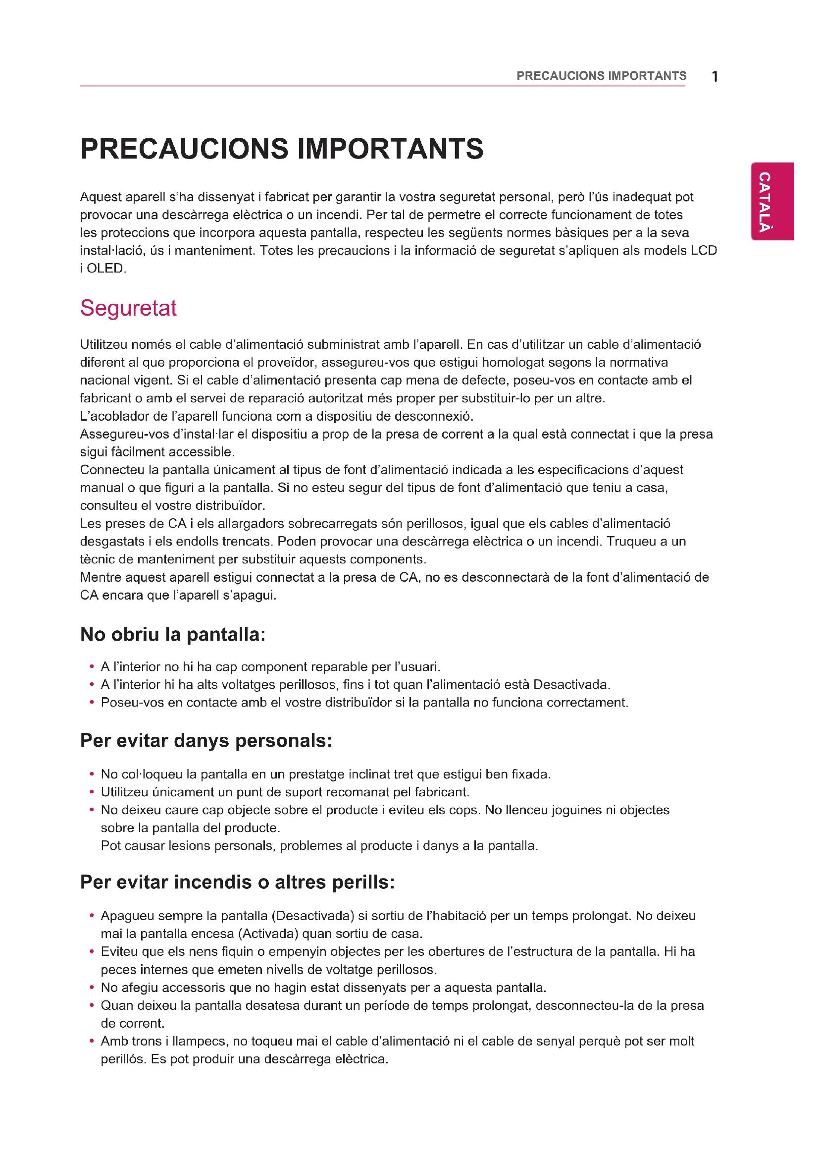 PRECAUCIONS IMPORTANTS Aquest aparell s’ha dissenyat i fabricat per garantir la vostra seguretat personal, però l’ús inadequat pot provocar una descàrrega elèctrica o un incendi. Per tal de permetre el correcte funcionament de totes les proteccions que incorpora aquesta pantalla, respecteu les següents normes bàsiques per a la seva instal·lació, ús i manteniment. Totes les precaucions i la informació de seguretat s’apliquen als models LCD i OLED. Seguretat Utilitzeu només el cable d’alimentació subministrat amb l’aparell. En cas d’utilitzar un cable d’alimentació diferent al que proporciona el proveïdor, assegureu-vos que estigui homologat segons la normativa nacional vigent. Si el cable d’alimentació presenta cap mena de defecte, poseu-vos en contacte amb el fabricant o amb el servei de reparació autoritzat més proper per substituir-lo per un altre.L’acoblador de l’aparell funciona com a dispositiu de desconnexió.Assegureu-vos d’instal·lar el dispositiu a prop de la presa de corrent a la qual està connectat i que la presa sigui fàcilment accessible.Connecteu la pantalla únicament al tipus de font d’alimentació indicada a les especificacions d’aquest manual o que figuri a la pantalla. Si no esteu segur del tipus de font d’alimentació que teniu a casa, consulteu el vostre distribuïdor.Les preses de CA i els allargadors sobrecarregats són perillosos, igual que els cables d’alimentació desgastats i els endolls trencats. Poden provocar una descàrrega elèctrica o un incendi. Truqueu a un tècnic de manteniment per substituir aquests components.Mentre aquest aparell estigui connectat a la presa de CA, no es desconnectarà de la font d’alimentació de CA encara que l’aparell s’apagui. No obriu la pantalla: