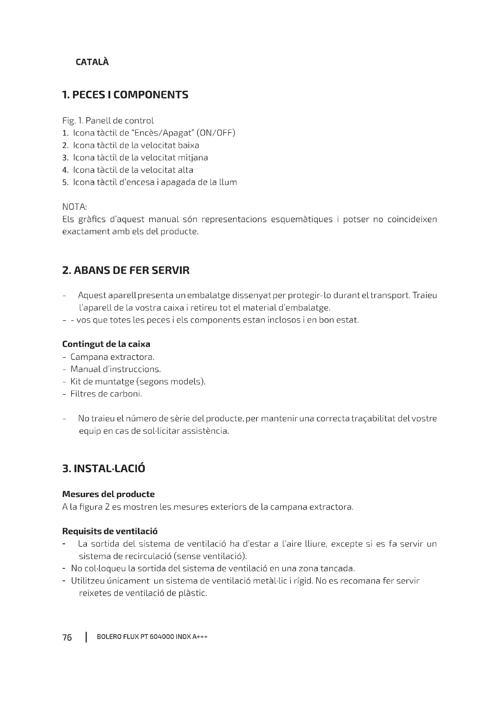 Mesures del producte A la gura 2 es mostren les mesures exteriors de la campana extractora. Requisits de ventilació - La sortida del sistema de ventilació ha d’estar a l’aire lliure, excepte si es fa servir un sistema de recirculació (sense ventilació). - No col·loqueu la sortida del sistema de ventilació en una zona tancada. - Utilitzeu únicament un sistema de ventilació metàl·lic i rígid. No es recomana fer servir reixetes de ventilació de plàstic.BOLERO FLUX PT 604000 INOX A+++ CATALÀ