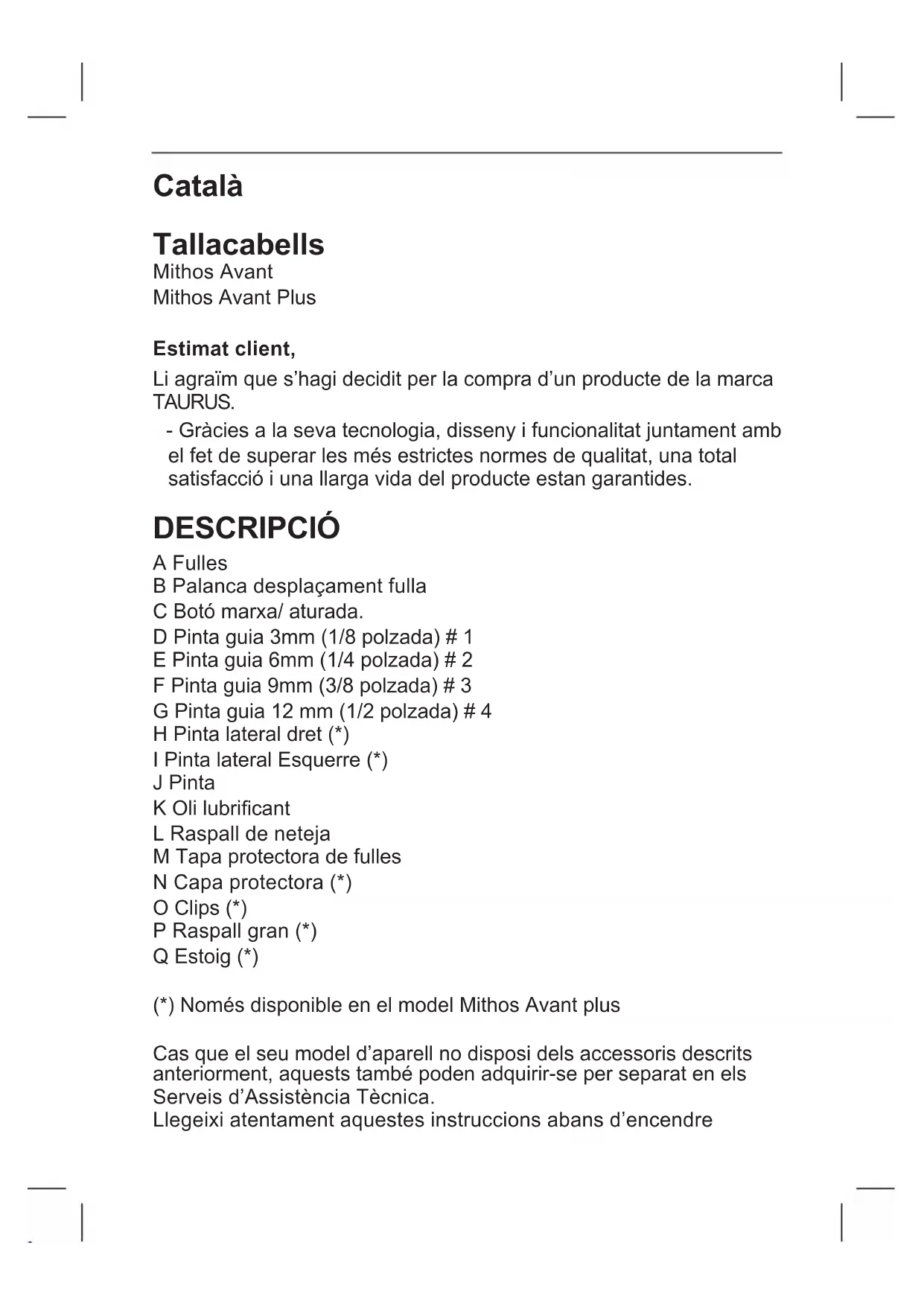 MANUAL D'USUARI Mithos Avant Plus TAURUS