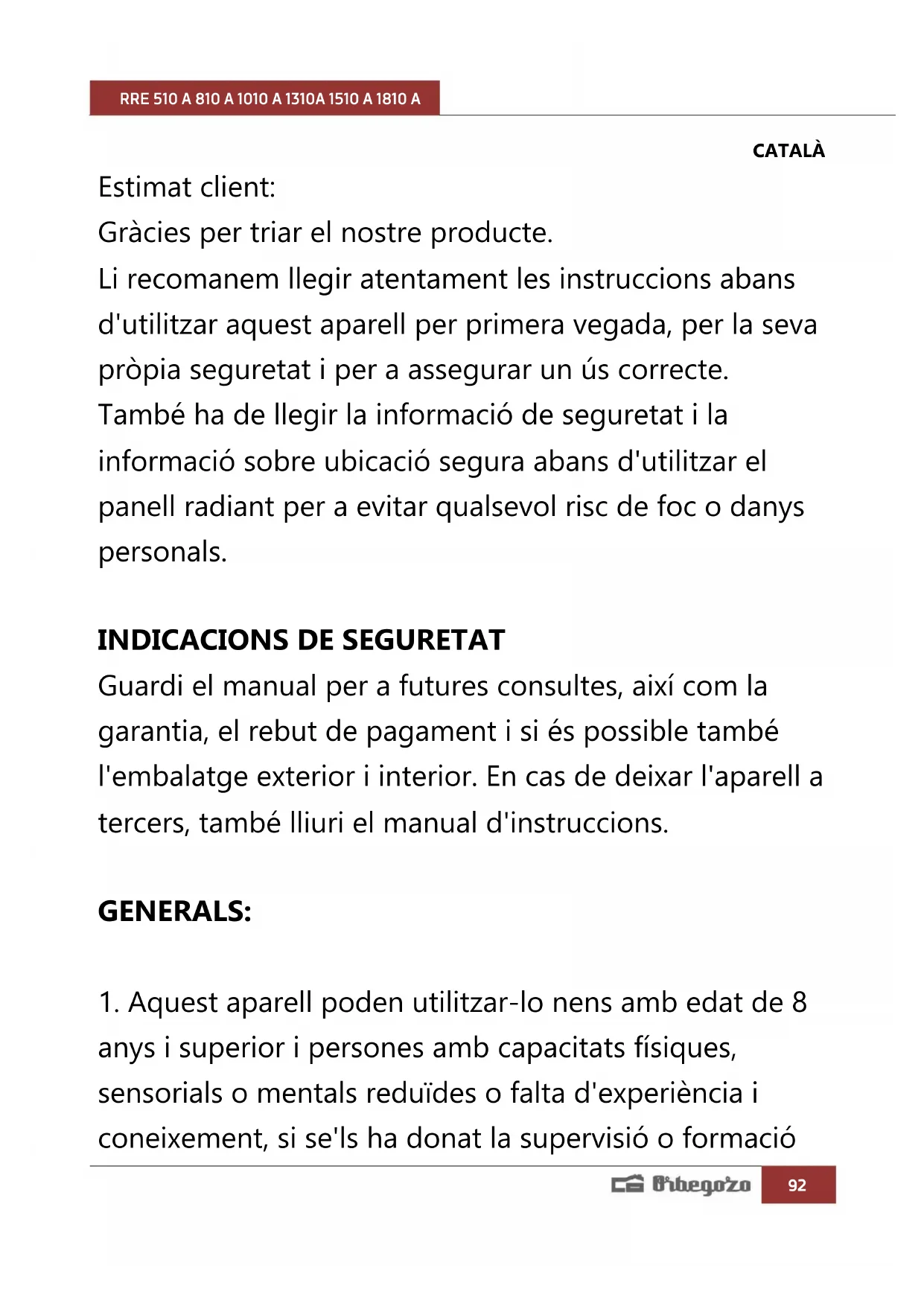 NETEJA Recomanem mantenir nets els radiadors elèctrics. Pot aparèixer pols, el qual pot arribar a cremar-se i dipositar-se en la paret i sobre l'emissor en forma de ratlles o àrees fosques. Aquestes taques es deuen exclusivament a la falta de neteja del radiador elèctric i de l'àrea adjacent. ELIMINACIÓ DE L'ELECTRODOMÈSTIC VELL. En base a la Norma europea 2012/19/UE de Residus d'aparells Elèctrics i Electrònics (RAEE), els electrodomèstics vells no poden ser llençats als contenidors municipals habituals; han de ser recollits selectivament per optimitzar la recuperació i el reciclatge dels components i materials que els constitueixen, i reduir l'impacte en la salut humana i el medi ambient. El símbol del contenidor d’escombraries es marca sobre tots els productes per recordar al consumidor l'obligació de separar-los per a la recollida selectiva. El consumidor ha de contactar amb l'autoritat local o amb el venedor per informar-se sobre la correcta eliminació del seu electrodomèstic vell. DECLARACIÓ DE CONFORMITAT: Aquest dispositiu compleix els requisits de la Directiva de Baixa Tensió 2014/35/EU i els requisits de la directiva de Compatibilitat Electromagnètica 2014/30/EU. GARANTIA Aquest aparell està cobert i compta amb el dret de la garantia legal d'acord amb la legislació vigent des de la data de compra. Conserveu el tiquet de compra per poder reclamar el vostre dret a la garantia. Per trobar el servei més proper a la seva localització contacteu a través del següent enllaç web: https://orbegozo.com/asistencia-tecnica/ Per a qualsevol tipus de consulta, dubte o incidència podeu posar-vos en contacte amb nosaltres a través del nostre correu electrònic reflectit a la pàgina principal d'aquest manual o a través del nostre servei d'assistència tècnica a https://orbegozo.com/contacto/ Orbegozo no es fa responsable dels components i accessoris que són objecte de desgast a causa de l'ús, així com els compostos peribles o que s'hagin deteriorat per un ús indegut. Tampoc no se'n farà responsable si el propietari ha modificat tècnicament l'aparell. Consulteu les condicions legals a la nostra pàgina web.RRE 510 A 810 A 1010 A 1310A 1510 A 1810 A