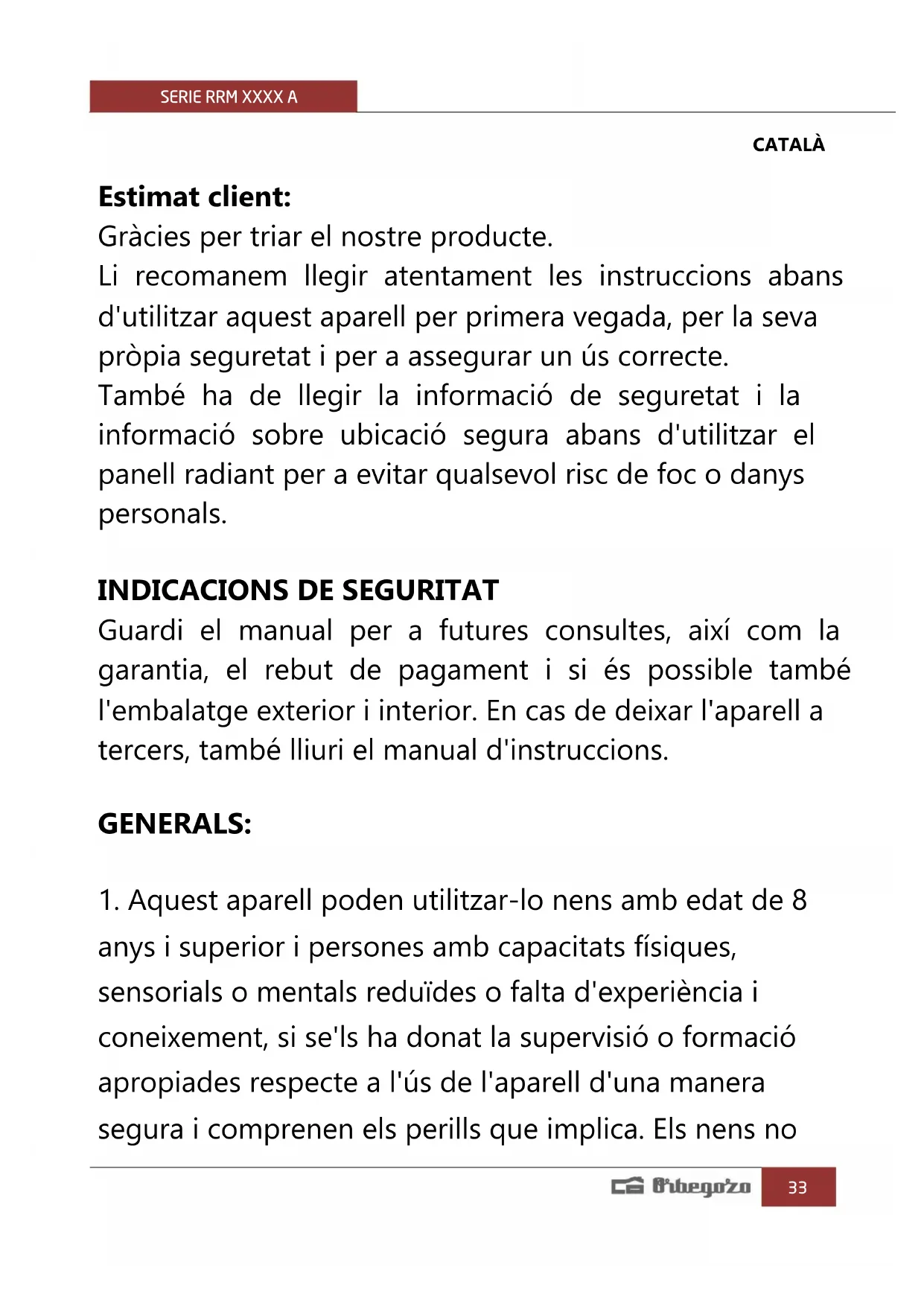 CATALÀ Estimat client: Gràcies per triar el nostre producte. Li recomanem llegir atentament les instruccions abans d'utilitzar aquest aparell per primera vegada, per la seva pròpia seguretat i per a assegurar un ús correcte. També ha de llegir la informació de seguretat i la informació sobre ubicació segura abans d'utilitzar el panell radiant per a evitar qualsevol risc de foc o danys personals.