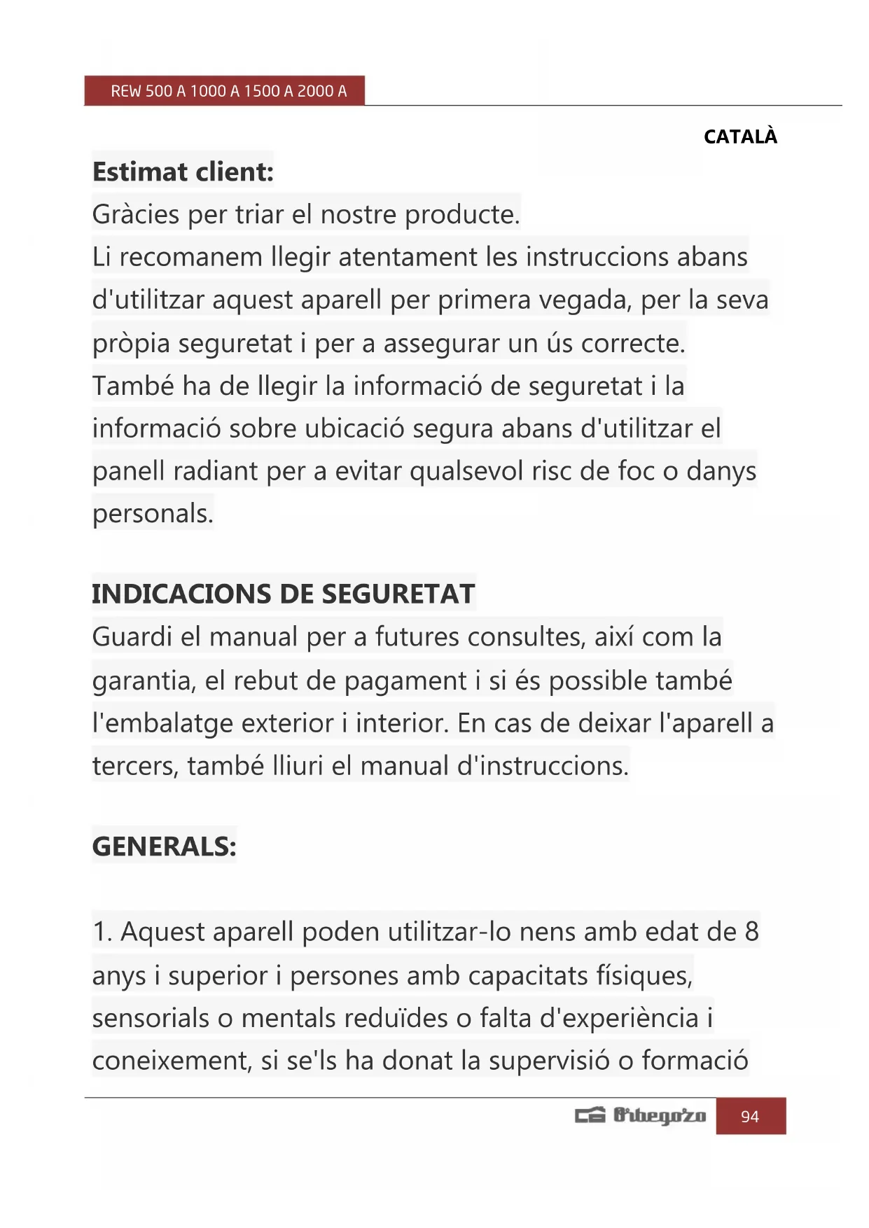 CATALÀ Estimat client: Gràcies per triar el nostre producte. Li recomanem llegir atentament les instruccions abans d'utilitzar aquest aparell per primera vegada, per la seva pròpia seguretat i per a assegurar un ús correcte. També ha de llegir la informació de seguretat i la informació sobre ubicació segura abans d'utilitzar el panell radiant per a evitar qualsevol risc de foc o danys personals.