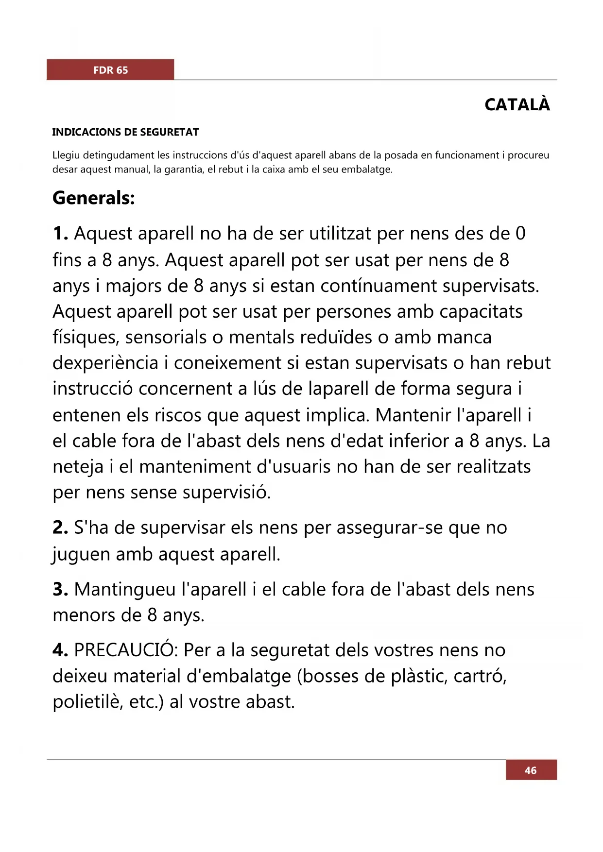 treball, ja que un nen podria estirar el cable i fer caure la fregidora. Després de netejar la fregidora, assegureu-vos que totes les peces estan completament seques. No deixeu la fregidora desatesa mentre està funcionant. No utilitzeu la fregidora si teniu algun tipus de dany, ja sigui al cable oa l'endoll. Feu que la revisin o que la reparin: consulteu l'apartat “reparacions”. Tingueu cura amb el vapor durant l'ús de la fregidora i en obrir la tapa. No col·loqueu la fregidora prop de plaques de cocció calentes o sobre aquestes. La fregidora està destinada únicament a ús domèstic. Els nens han d'estar vigilats per evitar que juguin amb la fregidora. No submergiu la fregidora en aigua per netejar-la. No utilitzeu la fregidora a l'exterior. Sempre desendolleu la fregidora després d'utilitzar-la. Algunes superfícies exteriors de la unitat s'escalfaran. Aneu amb compte quan toqueu aquestes zones per evitar lesions. Aquest aparell està previst per utilitzar-lo com a aparell d'ús domèstic i anàleg com a petites àrees de cuina a botigues, oficines i altres entorns laborals; casa de camp;FDR 65