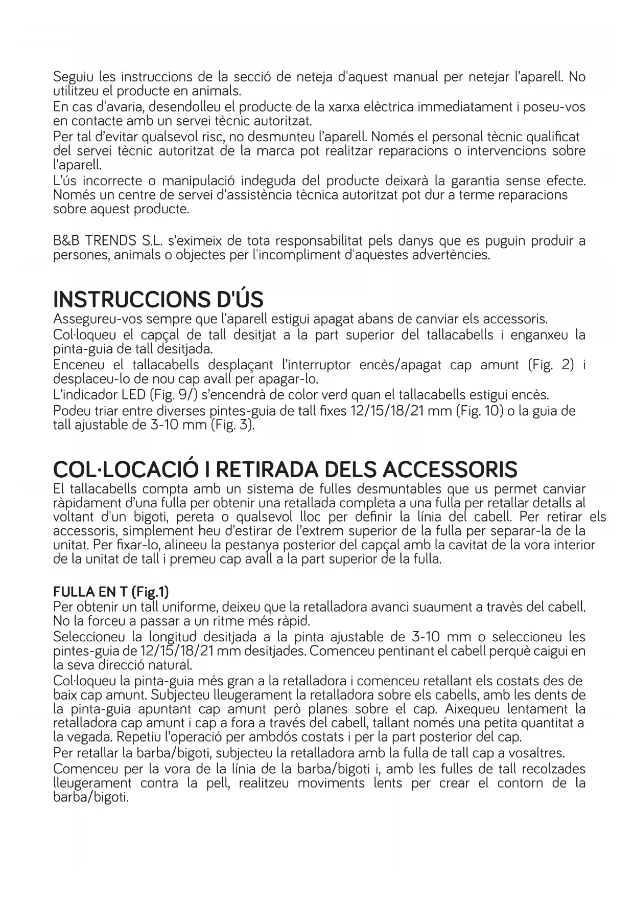 Aquest aparell està dissenyat per a ús domèstic i en cap cas no s'ha d'utilitzar per a ús comercial o industrial. No utilitzeu l’aparell sobre els cabells molls. No utilitzeu l’aparell, el connecteu ni el desconnecteu de la xarxa elèctrica amb les mans o els peus molls. No utilitzeu accessoris diferents dels subministrats pel fabricant. No utilitzeu aquest aparell prop de banyeres, dutxes, lavabos o altres dipòsits que continguin aigua. El cable de connexió a la xarxa elèctrica no ha d’estar enrotllat ni entortolligat al voltant del producte durant l'ús. No estireu el cable de connexió per desendollar-lo ni l’empreu per transportar l'aparell. No enrotlleu el cable al voltant de l’aparell. Seguiu les instruccions de la secció de neteja d'aquest manual per netejar l’aparell. No utilitzeu el producte en animals. En cas d'avaria, desendolleu el producte de la xarxa elèctrica immediatament i poseu-vos en contacte amb un servei tècnic autoritzat. Per tal d’evitar qualsevol risc, no desmunteu l’aparell. Només el personal tècnic qualificat del servei tècnic autoritzat de la marca pot realitzar reparacions o intervencions sobre l’aparell. L’ús incorrecte o manipulació indeguda del producte deixarà la garantia sense efecte. Només un centre de servei d'assistència tècnica autoritzat pot dur a terme reparacions sobre aquest producte. B&B TRENDS S.L. s’eximeix de tota responsabilitat pels danys que es puguin produir a persones, animals o objectes per l'incompliment d'aquestes advertències.