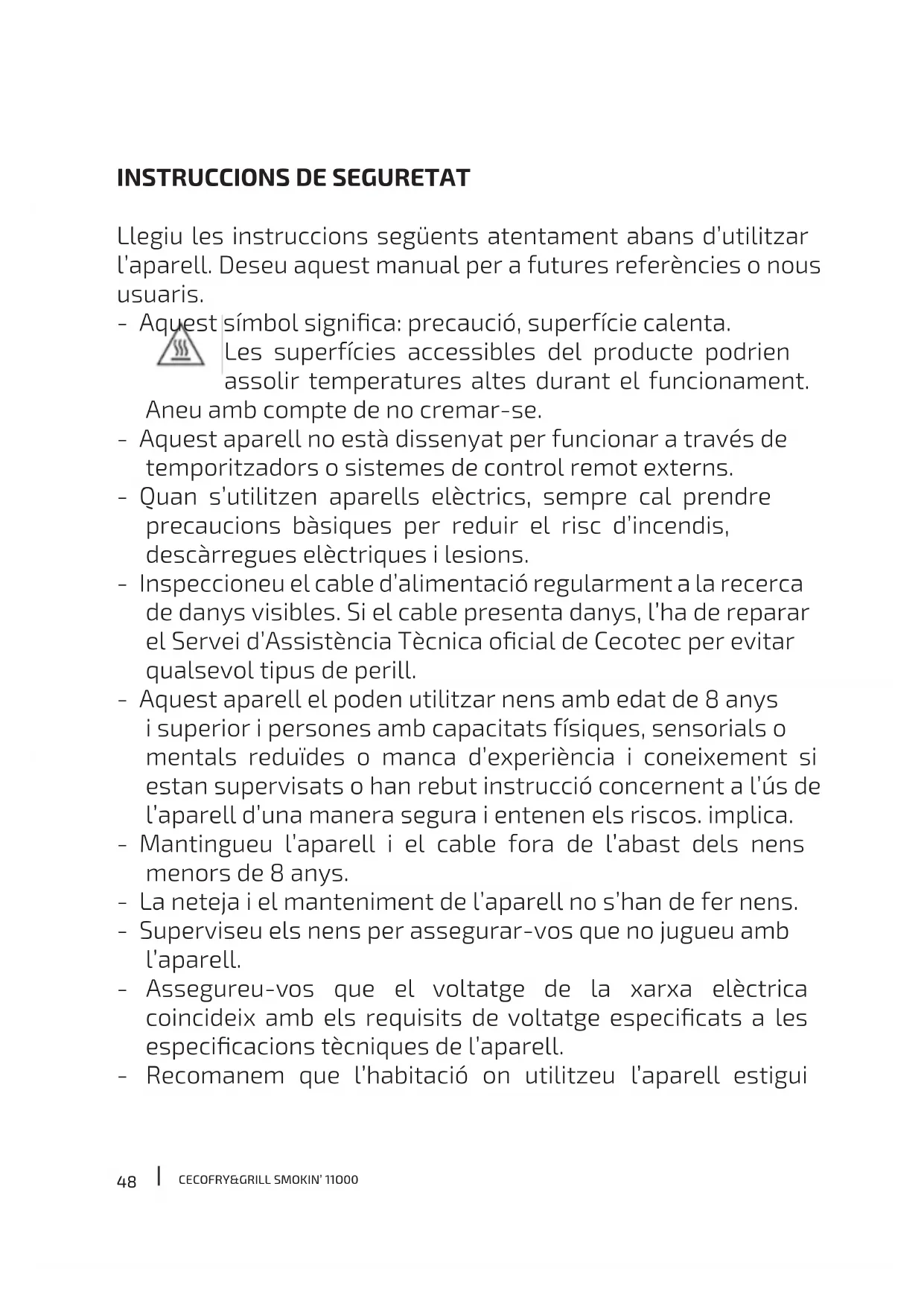 Llegiu les instruccions següents atentament abans d’utilitzar l’aparell. Deseu aquest manual per a futures referències o nous usuaris. - Aquest símbol signica: precaució, superfície calenta. Les superfícies accessibles del producte podrien assolir temperatures altes durant el funcionament. Aneu amb compte de no cremar-se. - Aquest aparell no està dissenyat per funcionar a través de temporitzadors o sistemes de control remot externs. - Quan s’utilitzen aparells elèctrics, sempre cal prendre precaucions bàsiques per reduir el risc d’incendis, descàrregues elèctriques i lesions. - Inspeccioneu el cable d’alimentació regularment a la recerca de danys visibles. Si el cable presenta danys, l’ha de reparar el Servei d’Assistència Tècnica ocial de Cecotec per evitar qualsevol tipus de perill. - Aquest aparell el poden utilitzar nens amb edat de 8 anys i superior i persones amb capacitats físiques, sensorials o mentals reduïdes o manca d’experiència i coneixement si estan supervisats o han rebut instrucció concernent a l’ús de l’aparell d’una manera segura i entenen els riscos. implica. - Mantingueu l’aparell i el cable fora de l’abast dels nens menors de 8 anys. - La neteja i el manteniment de l’aparell no s’han de fer nens. - Superviseu els nens per assegurar-vos que no jugueu amb l’aparell. - Assegureu-vos que el voltatge de la xarxa elèctrica coincideix amb els requisits de voltatge especicats a les especicacions tècniques de l’aparell. - Recomanem que l’habitació on utilitzeu l’aparell estiguiCECOFRY&GRILL SMOKIN’ 11O00