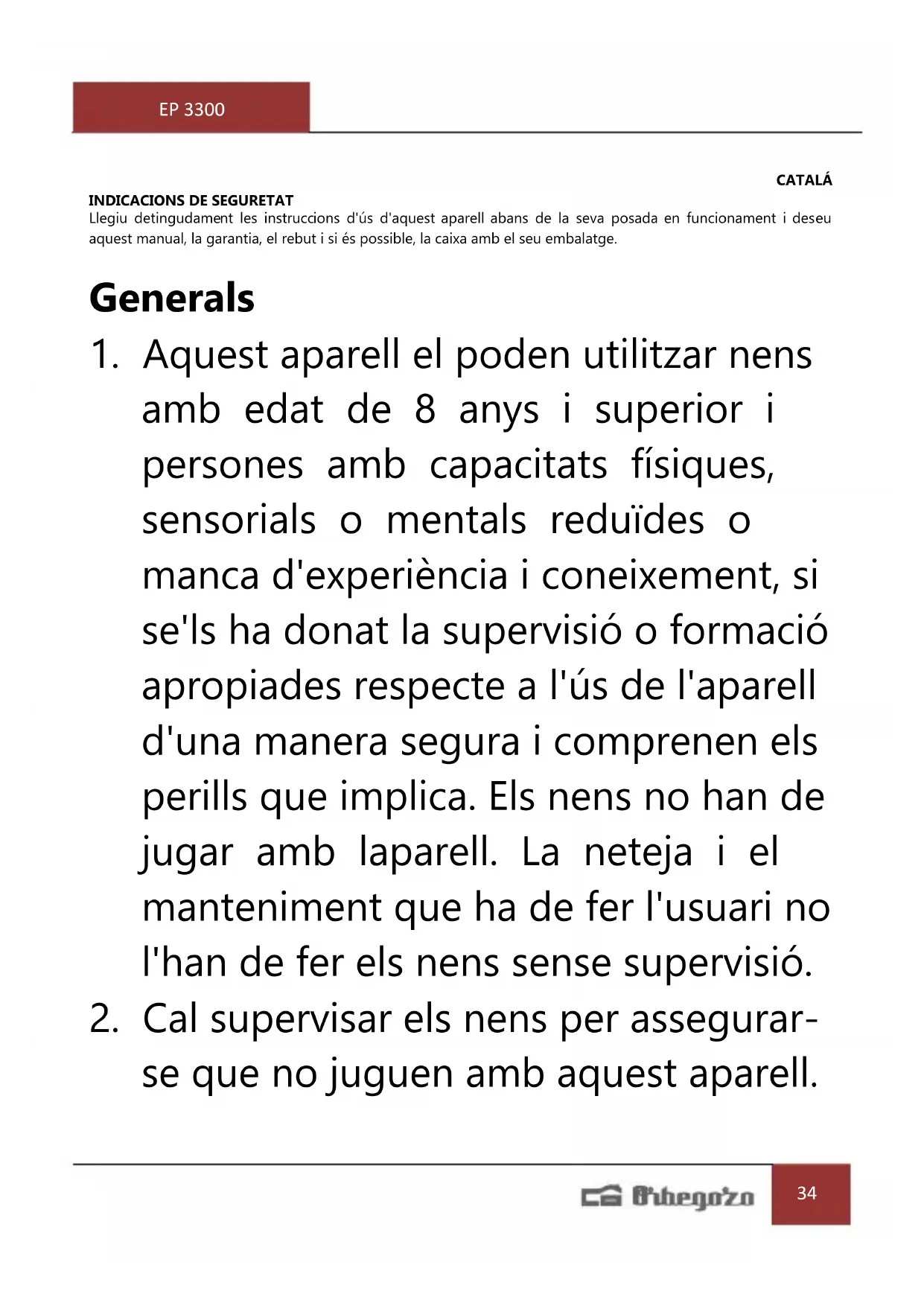 amb edat de 8 anys i superior i persones amb capacitats físiques, sensorials o mentals reduïdes o manca d'experiència i coneixement, si se'ls ha donat la supervisió o formació apropiades respecte a l'ús de l'aparell d'una manera segura i comprenen els perills que implica. Els nens no han de jugar amb laparell. La neteja i el manteniment que ha de fer l'usuari no l'han de fer els nens sense supervisió.