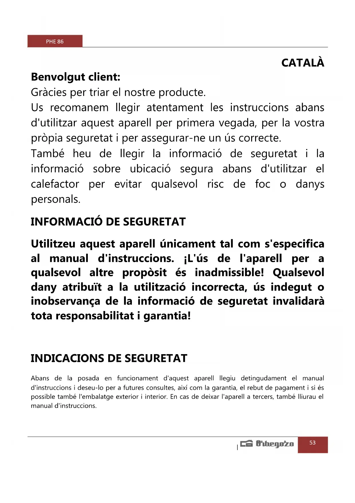Abans de la posada en funcionament d'aquest aparell llegiu detingudament el manual d'instruccions i deseu-lo per a futures consultes, així com la garantia, el rebut de pagament i si és possible també l'embalatge exterior i interior. En cas de deixar l'aparell a tercers, també lliurau el manual d'instruccions.PHE 86