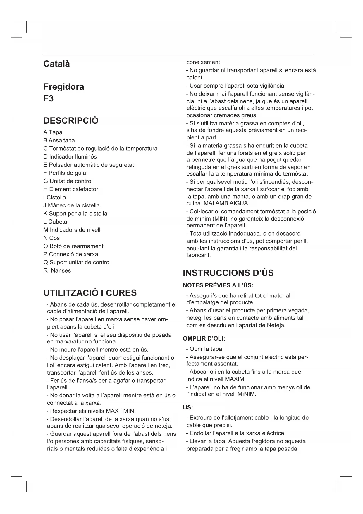 DESCRIPCIÓ A Tapa B Ansa tapa C Termòstat de regulació de la temperatura D Indicador lluminós E Polsador automàtic de seguretat F Perls de guia G Unitat de control H Element calefactor I Cistella J Mànec de la cistella K Suport per a la cistella L Cubeta M Indicadors de nivell N Cos O Botó de rearmament P Connexió de xarxa Q Suport unitat de control R Nanses