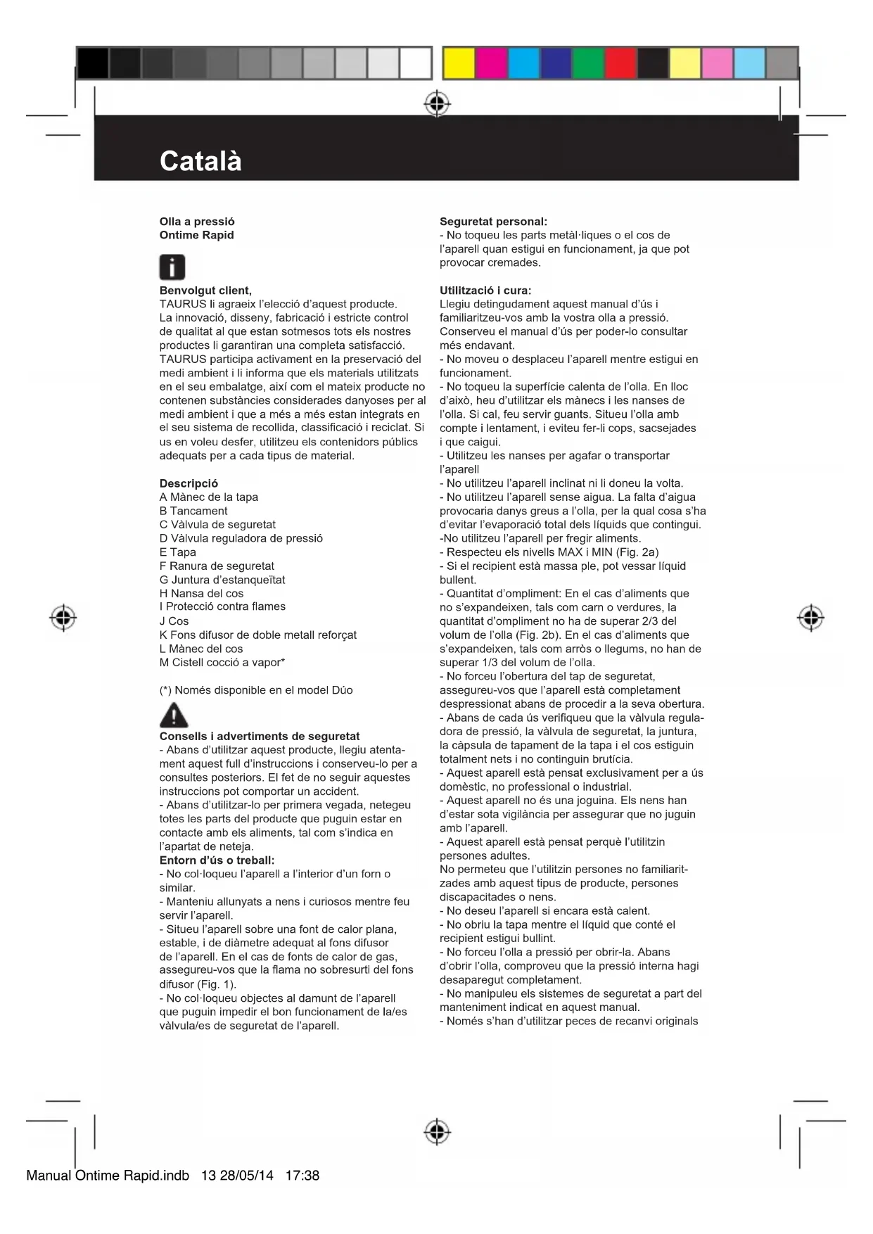 - El tiempo de cocción debe calcularse cuando salga una cantidad regular y constante de vapor de la válvula reguladora de presión. Este puede verse inuenciado por la cantidad de llenado, la temperatura y la potencia del calor. Los tiempos de cocción recomendados solo son sugerencias. Anomalías y reparación En el caso de que la olla no funcione correctamente, debe apagar el fogón inmediatamente, colocar la olla sobre una supercie plana y aclararla lentamente con agua para enfriarla y reducir la presión. Solo puede seguir utilizándose la olla a presión una vez eliminado el motivo de la avería. Manual Ontime Rapid.indb 11 28/05/14 17:38- En caso de detectar cualquier anomalía consulte la siguiente tabla: Anomalías Causas Soluciones La válvula reguladora de presión hace ruido y no expulsa vapor tras calentar la olla. (1) Taponamiento de la válvula reguladora de presión (2) Taponamiento del tubo salida de aire (3) Cocción sin líquido (4) Inclinación del fogón (1) Limpiar la válvula reguladora de presión (2) Eliminar la suciedad (3) Apagar inmediatamente el fogón, retirar la olla, reducir la presión y revisar la olla. (4) Calentar la olla en un fogón plano y estable La válvula de seguri- dad expulsa vapor o líquido. (1) Taponamiento del tubo salida de aire (2) La olla se ha llenado demasiado (3) La fuente de calor es demasiado potente (1) Eliminar la suciedad (2) Reducir la cantidad de llenado (3) Ajustar la fuente de calor al vapor que expulsa la válvula reguladora de presión. Sale vapor de la venta- na de seguridad El sistema de seguridad de la ventana está funcionan- do. Los demás sistemas de seguridad presentan problemas. Retirar la olla de la fuente de calor. Una vez fría, revisar todos los sistemas de seguridad. Acudir a un servicio técnico. La tapa no cierra bien La tapa se ha deformado Cambiar la tapa Se escapa vapor por debajo de la tapa. (1) Mal funcionamiento de la válvula reguladora de presión y de la válvula de seguridad (2) La junta de estanquei- dad no está bien colocada (3) Junta dañada (4) Taponamiento de la junta tórica (5) Tapa mal cerrada (1) Eliminar la suciedad de la válvula reguladora de presión y de la válvula de seguridad (2) Colocar la junta de estanqueidad correctamente (3) Sustituir la junta de estanqueidad (4) Limpiar la junta de estanqueidad (5) Cerrar la tapa correctamente - En caso de avería llevar el aparato a un Servicio de Asistencia Técnica autorizado. No intente desmon- tarlo o repararlo ya que puede existir peligro. Ecología y reciclabilidad del producto - Los materiales que constituyen el envase de este aparato, están integrados en un sistema de recogi- da, clasicación y reciclado de los mismos. Si desea deshacerse de ellos, puede utilizar los contenedores públicos apropiados para cada tipo de material. - El producto está exento de concentraciones de sustancias que se puedan considerar dañinas para el medio ambiente. Este aparato cumple con la Directiva 97/23/EC de Recipientes a Presión. Manual Ontime Rapid.indb 12 28/05/14 17:38Olla a pressió Ontime Rapid Benvolgut client, TAURUS li agraeix l’elecció d’aquest producte. La innovació, disseny, fabricació i estricte control de qualitat al que estan sotmesos tots els nostres productes li garantiran una completa satisfacció. TAURUS participa activament en la preservació del medi ambient i li informa que els materials utilitzats en el seu embalatge, així com el mateix producte no contenen substàncies considerades danyoses per al medi ambient i que a més a més estan integrats en el seu sistema de recollida, classicació i reciclat. Si us en voleu desfer, utilitzeu els contenidors públics adequats per a cada tipus de material. Descripció A Mànec de la tapa B Tancament C Vàlvula de seguretat D Vàlvula reguladora de pressió E Tapa F Ranura de seguretat G Juntura d’estanqueïtat H Nansa del cos I Protecció contra ames J Cos K Fons difusor de doble metall reforçat L Mànec del cos M Cistell cocció a vapor* (*) Només disponible en el model Dúo Consells i advertiments de seguretat - Abans d’utilitzar aquest producte, llegiu atenta- ment aquest full d’instruccions i conserveu-lo per a consultes posteriors. El fet de no seguir aquestes instruccions pot comportar un accident. - Abans d’utilitzar-lo per primera vegada, netegeu totes les parts del producte que puguin estar en contacte amb els aliments, tal com s’indica en l’apartat de neteja. Entorn d’ús o treball: - No col·loqueu l’aparell a l’interior d’un forn o similar. - Manteniu allunyats a nens i curiosos mentre feu servir l’aparell. - Situeu l’aparell sobre una font de calor plana, estable, i de diàmetre adequat al fons difusor de l’aparell. En el cas de fonts de calor de gas, assegureu-vos que la ama no sobresurti del fons difusor (Fig. 1). - No col·loqueu objectes al damunt de l’aparell que puguin impedir el bon funcionament de la/es vàlvula/es de seguretat de l’aparell. Seguretat personal: - No toqueu les parts metàl·liques o el cos de l’aparell quan estigui en funcionament, ja que pot provocar cremades. Utilització i cura: Llegiu detingudament aquest manual d’ús i familiaritzeu-vos amb la vostra olla a pressió. Conserveu el manual d’ús per poder-lo consultar més endavant. - No moveu o desplaceu l’aparell mentre estigui en funcionament. - No toqueu la superfície calenta de l’olla. En lloc d’això, heu d’utilitzar els mànecs i les nanses de l’olla. Si cal, feu servir guants. Situeu l’olla amb compte i lentament, i eviteu fer-li cops, sacsejades i que caigui. - Utilitzeu les nanses per agafar o transportar l’aparell - No utilitzeu l’aparell inclinat ni li doneu la volta. - No utilitzeu l’aparell sense aigua. La falta d’aigua provocaria danys greus a l’olla, per la qual cosa s’ha d’evitar l’evaporació total dels líquids que contingui. -No utilitzeu l’aparell per fregir aliments. - Respecteu els nivells MAX i 