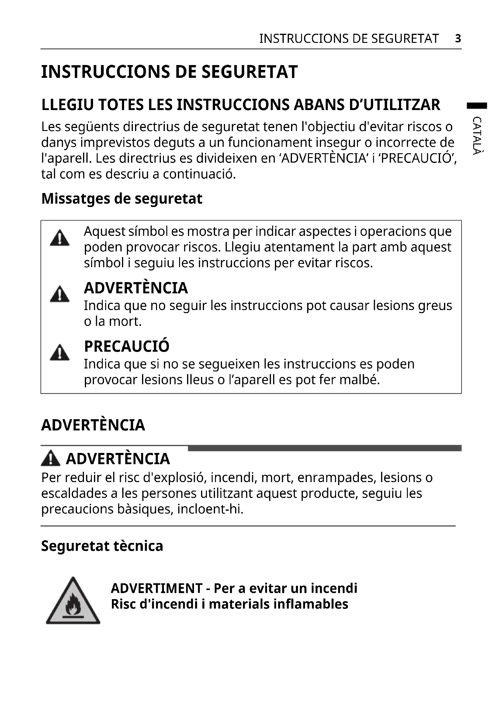 LLEGIU TOTES LES INSTRUCCIONS ABANS D’UTILITZAR Les següents directrius de seguretat tenen l'objectiu d'evitar riscos o danys imprevistos deguts a un funcionament insegur o incorrecte de l'aparell. Les directrius es divideixen en ‘ADVERTÈNCIA’ i ‘PRECAUCIÓ’, tal com es descriu a continuació. Missatges de seguretat ADVERTÈNCIA ADVERTÈNCIA Per reduir el risc d'explosió, incendi, mort, enrampades, lesions o escaldades a les persones utilitzant aquest producte, seguiu les precaucions bàsiques, incloent-hi. Seguretat tècnica Aquest símbol es mostra per indicar aspectes i operacions que poden provocar riscos. Llegiu atentament la part amb aquest símbol i seguiu les instruccions per evitar riscos. ADVERTÈNCIA Indica que no seguir les instruccions pot causar lesions greus o la mort. PRECAUCIÓ Indica que si no se segueixen les instruccions es poden provocar lesions lleus o l’aparell es pot fer malbé. ADVERTIMENT - Per a evitar un incendi Risc d'incendi i materials inflamables4