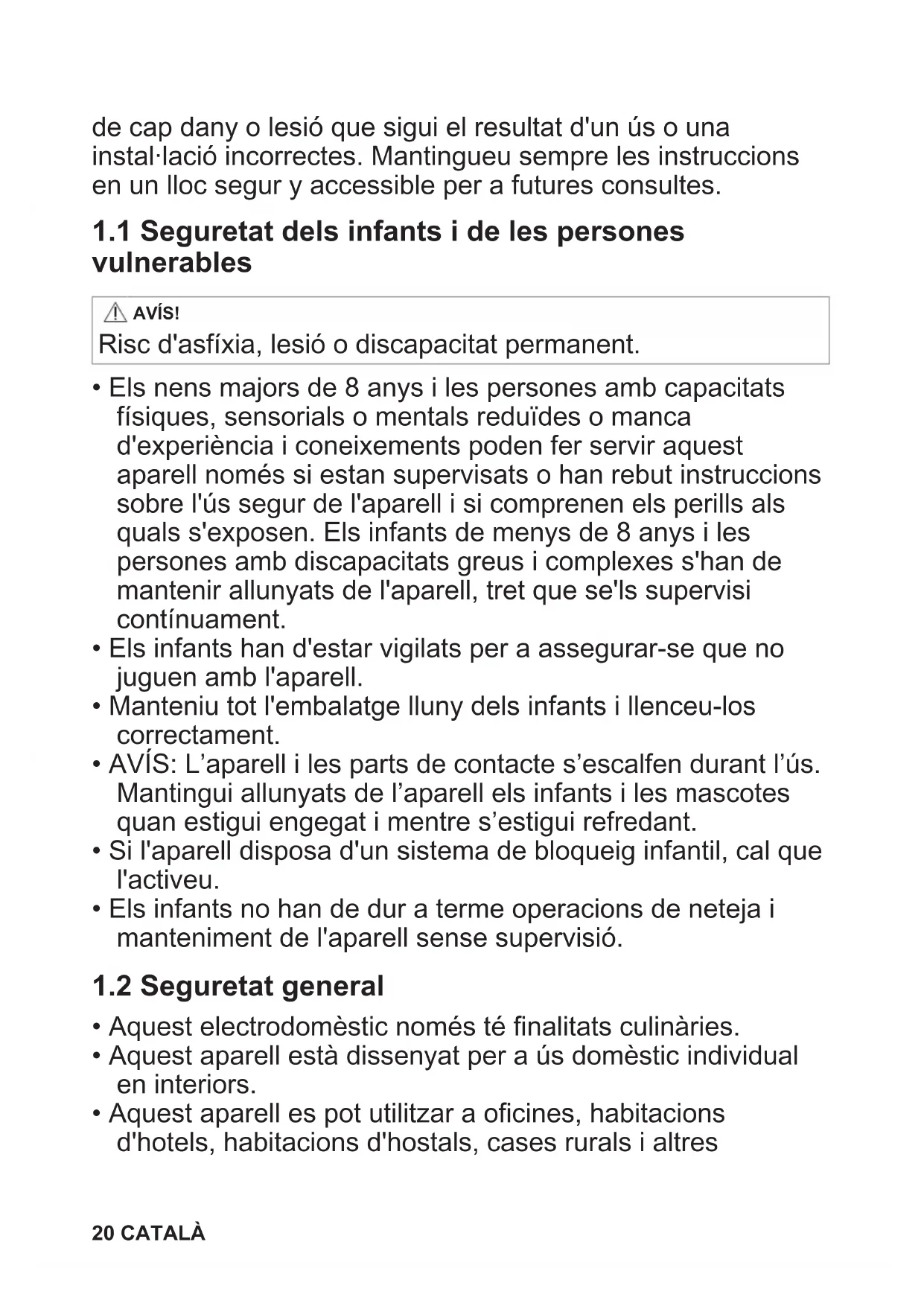 - Els nens majors de 8 anys i les persones amb capacitats físiques, sensorials o mentals reduïdes o manca d'experiència i coneixements poden fer servir aquest aparell només si estan supervisats o han rebut instruccions sobre l'ús segur de l'aparell i si comprenen els perills als quals s'exposen. Els infants de menys de 8 anys i les persones amb discapacitats greus i complexes s'han de mantenir allunyats de l'aparell, tret que se'ls supervisi contínuament.