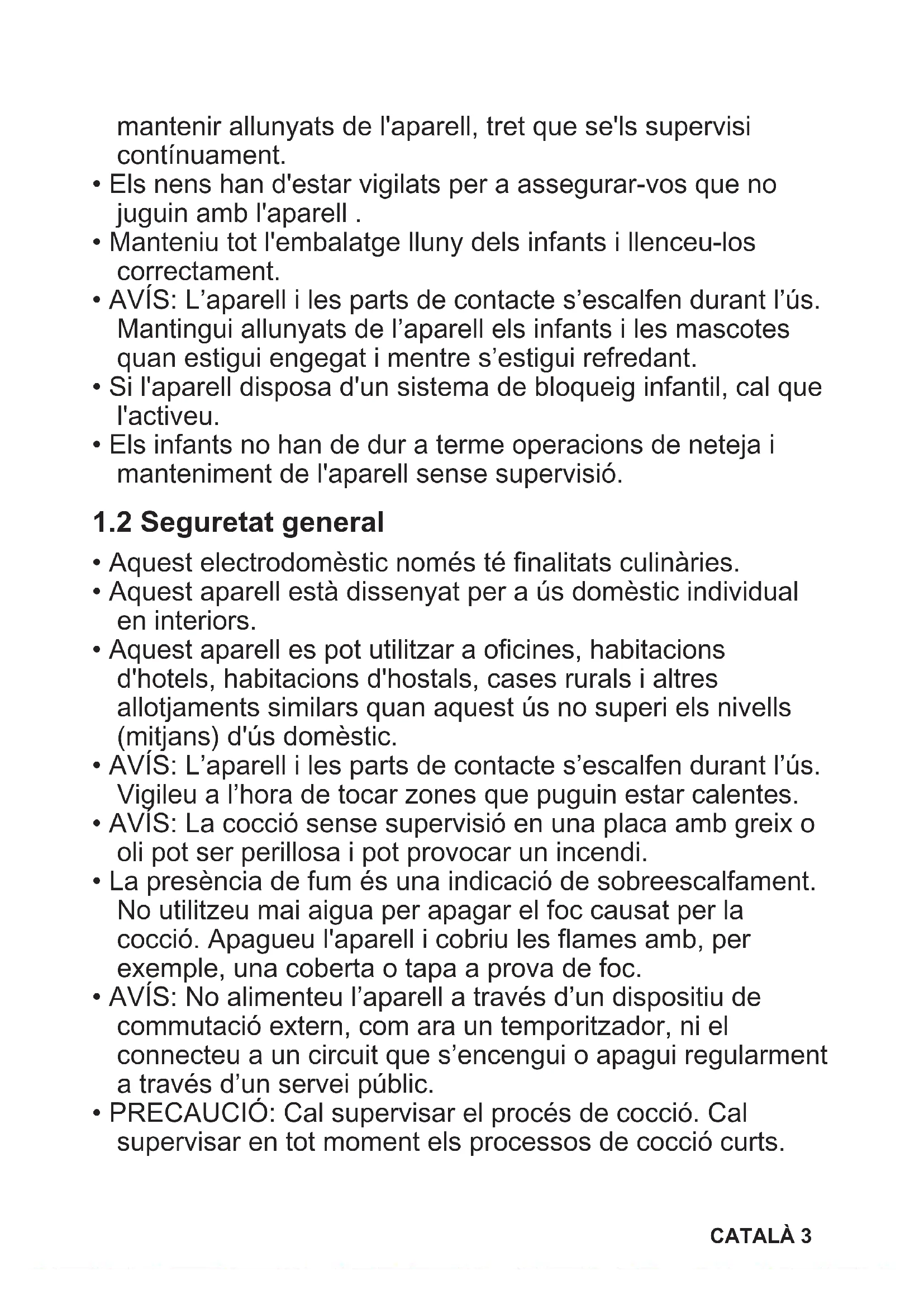 - PRECAUCIÓ: Cal supervisar el procés de cocció. Cal supervisar en tot moment els processos de cocció curts. CATALÀ 3• AVÍS: Perill d’incendi: No deseu objectes sobre les superfícies de cocció.