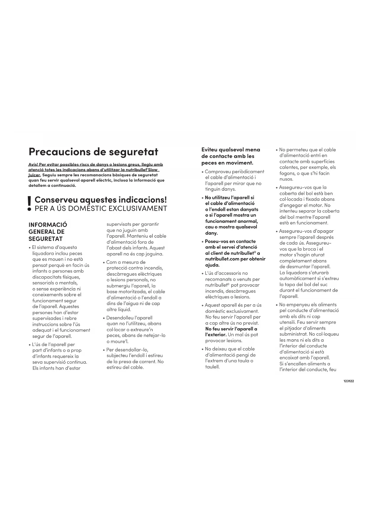 nutribullet.com per obtenir ajuda.• L’ús d’accessoris no recomanats o venuts per nutribullet pot provocar incendis, descàrregues elèctriques o lesions. • Aquest aparell és per a ús domèstic exclusivament. No feu servir l’aparell per a cap altre ús no previst. No feu servir l’aparell a l’exterior. Un mal ús pot provocar lesions.• No deixeu que el cable d’alimentació pengi de l’extrem d’una taula o taulell. • No permeteu que el cable d’alimentació entri en contacte amb superfícies calentes, per exemple, els fogons, o que s’hi facin nusos.• Assegureu-vos que la coberta del bol està ben col·locada i fixada abans d’engegar el motor. No intenteu separar la coberta del bol mentre l’aparell està en funcionament.• Assegureu-vos d’apagar sempre l’aparell després de cada ús. Assegureu-vos que la broca i el motor s’hagin aturat completament abans de desmuntar l’aparell. La liquadora s’aturarà automàticament si s’extreu la tapa del bol del suc durant el funcionament de l’aparell.• No empenyeu els aliments pel conducte d’alimentació amb els dits ni cap utensili. Feu servir sempre el pitjador d’aliments subministrat. No col·loqueu les mans ni els dits a l’interior del conducte d’alimentació si està encaixat amb l’aparell. Si s’encallen aliments a l’interior del conducte, feu125124 servir el pitjador d’aliments subministrat per pitjar- los cap avall. Apagueu el motor i assegureu-vos que totes les peces movibles s’hagin aturat abans de desmuntar la liquadora i retirar els aliments restants.
