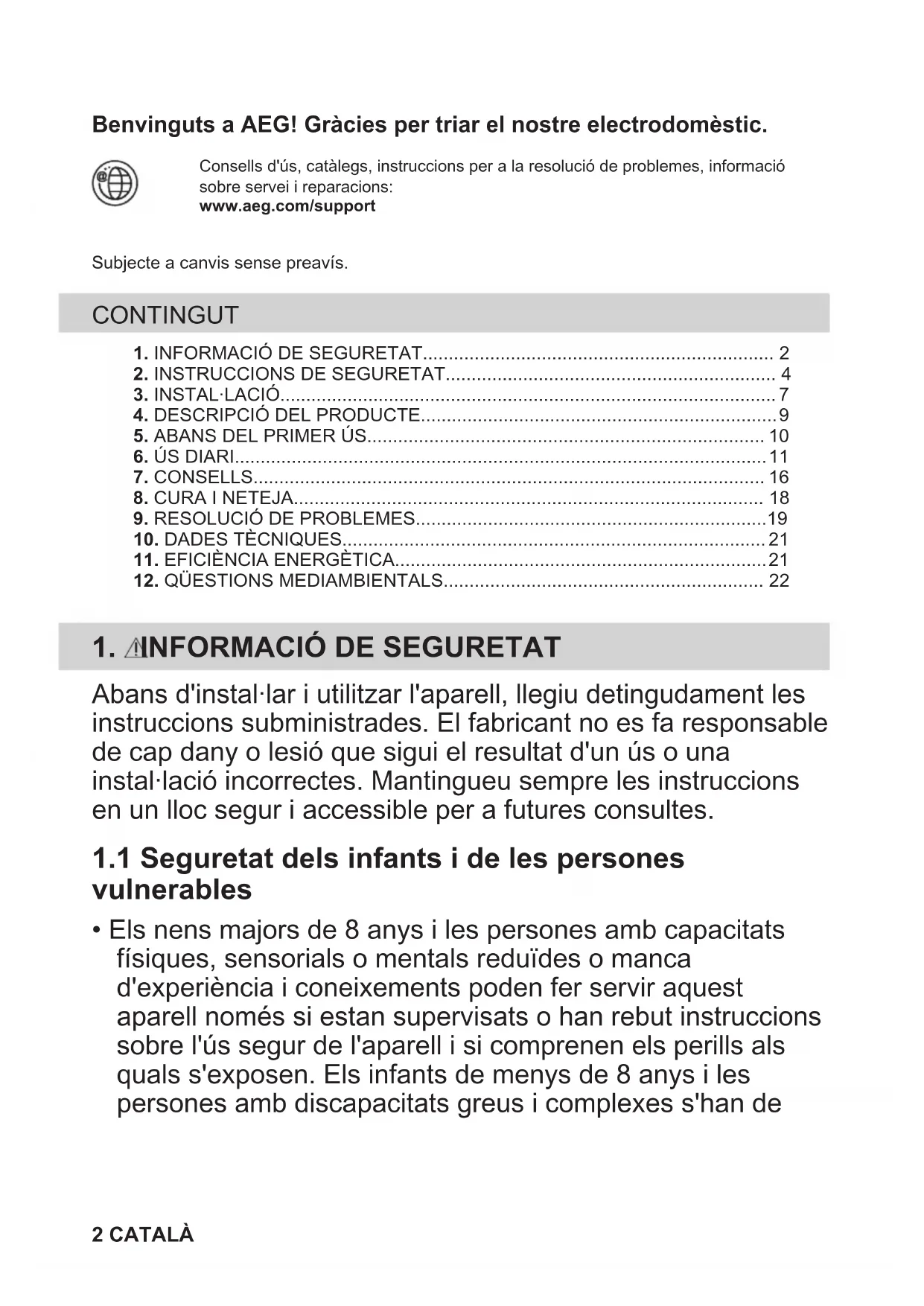 Recicleu els materials amb el símbol . Dipositeu l'embalatge en contenidors adequats per al seu posterior reciclatge. Ajudeu a protegir el medi ambient i la salut humana i a reciclar les deixalles procedents d'aparells elèctrics i electrònics. No llenceu a les escombraries domèstiques els aparells amb el símbol . Porteu el producte a les instal·lacions de reciclatge locals o poseu-vos en contacte amb la seva oficina municipal. 22 CATALÀBienvenue chez AEG ! Nous vous remercions d’avoir choisi l’un de nos appareils. Obtenir des conseils d’utilisation, des brochures, un dépanneur, des informations surle service et les réparations :www.aeg.com/supportSous réserve de modifications.