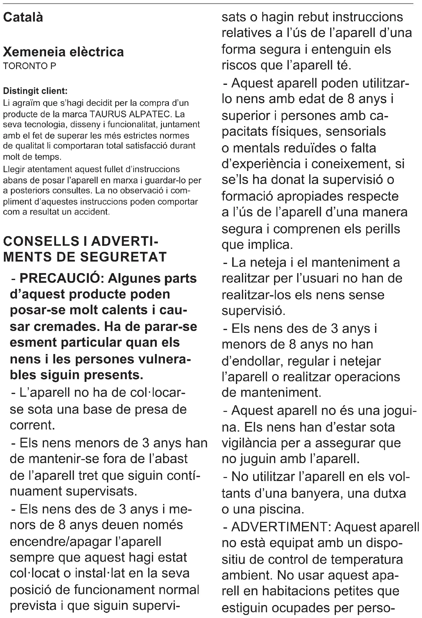 - PRECAUCIÓ: Algunes parts d’aquest producte poden posar-se molt calents i cau- sar cremades. Ha de parar-se esment particular quan els nens i les persones vulnera- bles siguin presents. - L’aparell no ha de col·locar- se sota una base de presa de corrent. - Els nens menors de 3 anys han de mantenir-se fora de l’abast de l’aparell tret que siguin contí- nuament supervisats. - Els nens des de 3 anys i me- nors de 8 anys deuen només encendre/apagar l’aparell sempre que aquest hagi estat col·locat o instal·lat en la seva posició de funcionament normal prevista i que siguin supervi- sats o hagin rebut instruccions relatives a l’ús de l’aparell d’una forma segura i entenguin els riscos que l’aparell té. - Aquest aparell poden utilitzar- lo nens amb edat de 8 anys i superior i persones amb ca- pacitats físiques, sensorials o mentals reduïdes o falta d’experiència i coneixement, si se’ls ha donat la supervisió o formació apropiades respecte a l’ús de l’aparell d’una manera segura i comprenen els perills que implica. - La neteja i el manteniment a realitzar per l’usuari no han de realitzar-los els nens sense supervisió. - Els nens des de 3 anys i menors de 8 anys no han d’endollar, regular i netejar l’aparell o realitzar operacions de manteniment. - Aquest aparell no és una jogui- na. Els nens han d’estar sota vigilància per a assegurar que no juguin amb l’aparell. - No utilitzar l’aparell en els vol- tants d’una banyera, una dutxa o una piscina. - ADVERTIMENT: Aquest aparell no està equipat amb un dispo- sitiu de control de temperatura ambient. No usar aquest apa- rell en habitacions petites que estiguin ocupades per perso-nes que no siguin capaces d’abandonar l’habitació pels seus mitjans, tret que estiguin sotmeses una vigilància cons- tant. - PRECAUCIÓ: A d’evitar un perill degut al rearmament no desitjat del protector tèrmic, no s’ha d’alimentar a l’aparell a través d’un dispositiu interruptor extern, tal com un programador, o connectar-lo a un circuit que s’encengui i apagui regularment a través de la companyia de distribució d’energia elèctrica. - Si la connexió xarxa està dan- yada, ha de ser substituïda, portar l’aparell a un Servei d’Assistència Tècnica autorit- zat. Amb la nalitat d’evitar un perill, no intenti desmuntar-lo o reparar-lo per si mateix. - Aquest aparell està pensat únicament per a un ús domès- tic, no per a ús professional o industrial. - Aquest símbol indica que l’aparell no s’ha de cobrir. - ADVERTIMENT: A d’evitar un sobreescalfament, no cobrir l’aparell. - Abans de connectar l’aparell a la xarxa, vericar que el voltatge indicat en la placa de caracterís- tiques coincideix amb el voltatge de xarxa. - Connectar l’aparell a una base de presa de corrent que suport com a mínim 10 amperes. - La clavilla de l’aparell ha de coincidir amb la base elèctrica de la presa de corrent. Mai modi- car la clavilla. No usar adaptadors de clavilla. - Ha d’estar prevista una ventilació adequada de la sala, si en la mateixa sala on s’instal·li l’aparell poden utilitzar-se simultàniament altres aparells alimentats a gas o un altre combustible. - L’aparell ha d’utilitzar-se i col·locar-se sobre una superfície plana i estable. - Situar l’aparell lluny de material combustible, com ara materials tèxtils, cartó, paper… - No situar material combustible en els voltants de l’aparell. - No usar l’aparell associat a un programador, temporitzador o un altre dispositiu que connecti l’aparell automàticament. - No utilitzar l’aparell amb el cable elèctric o la clavilla danyada. - Si alguna de les envolupants de l’aparell es trenca, desconnectar immediatament l’aparell de la xarxa per a evitar la possibilitat de sofrir un xoc elèctric. - ADVERTIMENT: Mantenir l’aparell sec. - ADVERTIMENT: No utilitzar l’aparell prop de l’aigua. - No utilitzar l’aparell amb les mans o els peus humits, ni amb els peus descalços. - No forçar el cable elèctric de connexió. Mai usar el cable elèctric per a aixecar, transportar o desendollar l’aparell. - No deixar que el cable elèctric de connexió quedi atrapat o arrugat. - No deixar que el cable elèctric de connexió quedi en contacte amb les superfícies calentes de l’aparell. - Mantenir l’aparell lluny de fonts de calor, olis, cants vius o peces en moviment. - Vericar l’estat del cable elèctric de connexió. Els cables danyats o embullats augmenten el risc de xoc elèctric. - Aquest aparell no és adequat per a ús en exteriors. - El cable d’alimentació ha de ser examinat regu- larment a la recerca de signes de mal, i si està danyat, l’aparell no ha d’usar-se. - No utilitzar ni guardar l’aparell a la intempèrie. - No exposar l’aparell a la pluja o condicions d’humitat. L’aigua que entre en l’aparell aug- mentarà el risc de xoc elèctric. - No tocar la clavilla de connexió amb les mans mullades. - Aquest aparell no pot col·locar-se encastat a la paret.- No usar cap altre element decoratiu que no sigui subministrat amb l’aparell. UTILITZACIÓ I CURES: - No usar l’aparell si el seu dispositiu de posada en marxa/atur no funciona. - No utilitzar l’aparell inclinat, ni donar-li la volta. - Desendollar l’aparell de la xarxa quan no s’usi i abans de realitzar qualsevol operació de neteja. - Guardar aquest aparell fora de l’abast dels nens i/o persones amb capacitats físiques, senso- rials o mentals reduïdes o falta d’experiència i coneixement. - Vericar que les reixes de ventilació de l’aparell no quedin obstruïdes per pols, brutícia o altres objectes. - No deixar mai l’aparell connectat i sense vigilàn- cia. A més, estalviarà energia i prolongarà la vida de l’aparell. - No usar l’aparell per a assecar peces tèxtils de cap mena. - ADVERTIMENT: No quedar-se adormit mentre s’usi aquest aparell, ja que existeix risc de danys. SERVEI: - Cerciorar-se