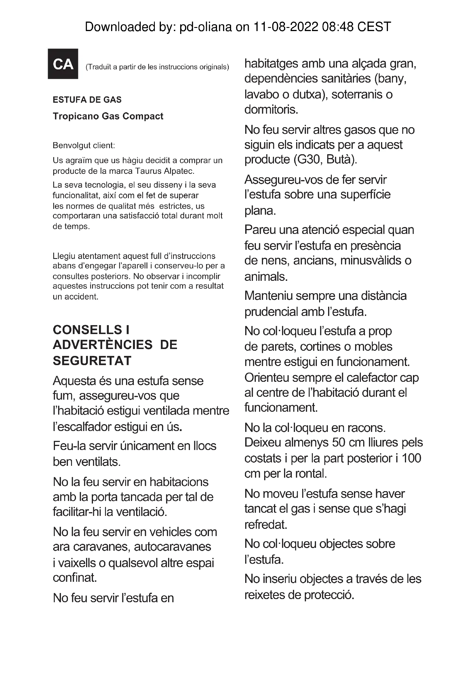 SEGURETAT Aquesta és una estufa sense fum, assegureu-vos que l’habitació estigui ventilada mentre l’escalfador estigui en ús. Feu-la servir únicament en llocs ben ventilats. No la feu servir en habitacions amb la porta tancada per tal de facilitar-hi la ventilació. No la feu servir en vehicles com ara caravanes, autocaravanes i vaixells o qualsevol altre espai connat. No feu servir l’estufa en habitatges amb una alçada gran, dependències sanitàries (bany, lavabo o dutxa), soterranis o dormitoris. No feu servir altres gasos que no siguin els indicats per a aquest producte (G30, Butà). Assegureu-vos de fer servir l’estufa sobre una superfície plana. Pareu una atenció especial quan feu servir l’estufa en presència de nens, ancians, minusvàlids o animals. Manteniu sempre una distància prudencial amb l’estufa. No col·loqueu l’estufa a prop de parets, cortines o mobles mentre estigui en funcionament. Orienteu sempre el calefactor cap al centre de l’habitació durant el funcionament. No la col·loqueu en racons. Deixeu almenys 50 cm lliures pels costats i per la part posterior i 100 cm per la rontal. No moveu l’estufa sense haver tancat el gas i sense que s’hagi refredat. No col·loqueu objectes sobre l’estufa. No inseriu objectes a través de les reixetes de protecció. CA (Traduït a partir de les instruccions originals) Downloaded by: pd-oliana on 11-08-2022 08:48 CESTLa reixeta de protecció d’aquest electrodomèstic compleix els requisits de la norma. No ofereix protecció completa per als nens petits o malalts. El protector és per evitar el risc de lesions, per la qual cosa no se n’ha de treure ni alterar cap part. No feu servir l’estufa per a eixugar roba, teixits o altres materials. A més a més, mai no poseu cap d’aquests elements davant la reixeta. No col·loqueu mai un recipient amb aigua sobre l’estufa. No feu servir l’estufa si alguna de les seves parts ha estat en contacte amb l’aigua o en situacions d’alta humitat. En aquest cas, consulteu un tècnic autoritzat. En cas de mal funcionament, consulteu sempre un tècnic especialitzat autoritzat. No emmagatzemeu ni feu servir materials ni líquids inamables a les proximitats de l’estufa. En cas de fuita, l’alimentació de gas a l’aparell s’ha de tallar mitjançant la vàlvula de l’ampolla de gas. No exposeu l’ampolla a ple sol a l’estiu ni molt a prop d’un focus de calor. No col·loqueu l’estufa en funcionament a prop de cortines, mobles, panells de fusta o materials combustibles que es puguin deteriorar amb la calor. No la feu servir en dormitoris mentre dormiu ni en cap habitació on hi hagi algú dormint. No l’exposeu a agents atmosfèrics. Eviteu que els nens petits puguin acostar-se a l’estufa mentre estigui en funcionament. Superviseu que no juguin amb ella. Pareu atenció i comproveu que el tub del gas no es doblega en excés de manera que eviti el trànsit de gas. Tanqueu el pas del gas sempre que no feu servir l’estufa. Respecteu amb cura les condicions d’instal·lació i si noteu olor de gas: -Tanqueu el pas de gas al regulador de la bombona. -Obriu les nestres. No connecteu cap interruptor elèctric i apagueu qualsevol tipus de ama. Aviseu un tècnic autoritzat. No col·loqueu l’ampolla en posició horitzontal. Si l’estufa s’apaga Downloaded by: pd-oliana on 11-08-2022 08:48 CESTautomàticament, no l’engegueu immediatament. Abans, deixeu que entri aire nou i fresc a l’habitació. Si el problema continua, consulteu un servei tècnic. No feu servir mai l’aspirador sobre el panell catalític, no bufeu a sobre ni hi llenceu cap líquid. La neteja del panell catalític o dels components de seguretat l’ha de fer personal tècnic acreditat. Comproveu regularment l’estat del tub exible del gas i la data de caducitat. Mai no feu servir tubs o reguladors de gas que no compleixin amb la normativa vigent. Contacteu un servei tècnic en cas de dubte. Nota: El calefactor incorpora diversos dispositius de seguretat que apagarà el calefactor en condicions insegures: