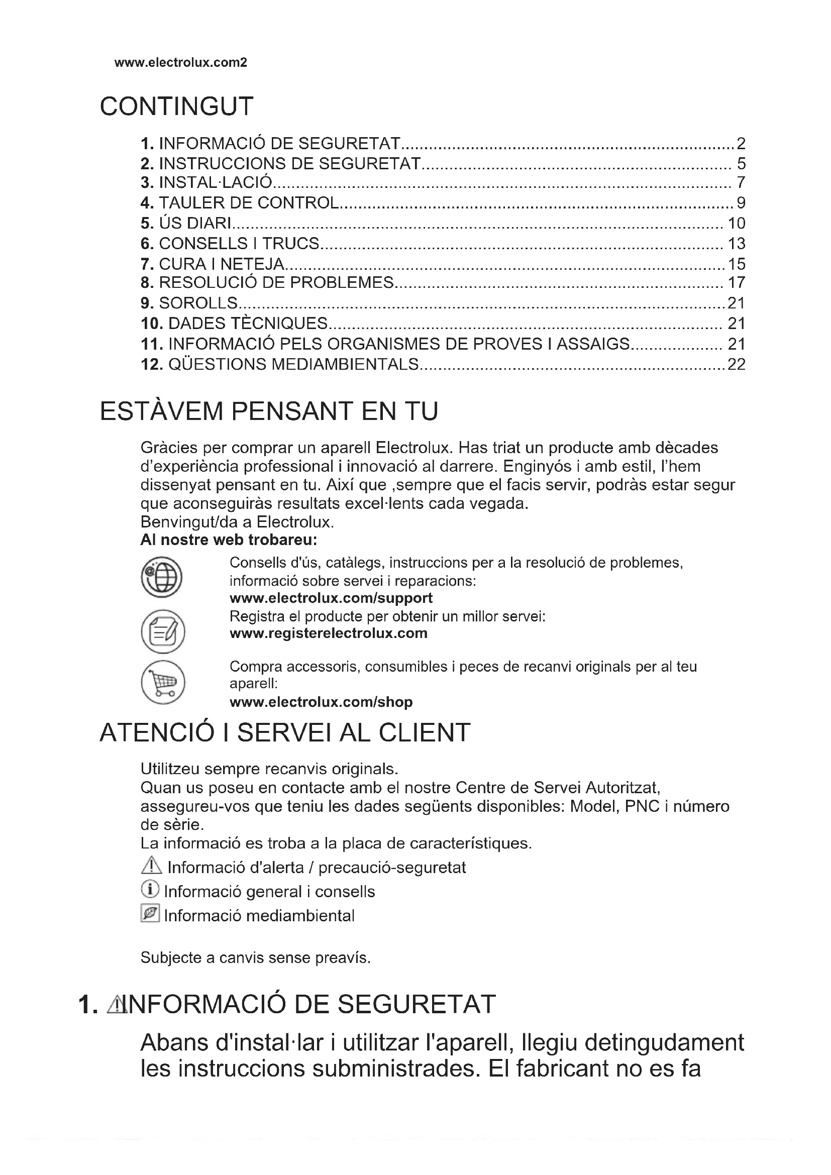 Recicli els materials amb el símbol . Dipositi l'embalatge en contenidors adequats per al seu posterior reciclatge. Ajudi a protegir el medi ambient i la salut humana i a reciclar les deixalles procedents d'aparells elèctrics i electrònics. No llenci a les escombraries domèstiques els aparells amb el símbol . Porti el producte a les instal·lacions de reciclatge locals o posi's en contacte amb la seva oficina municipal. www.electrolux.com22TABLE DES MATIÈRES