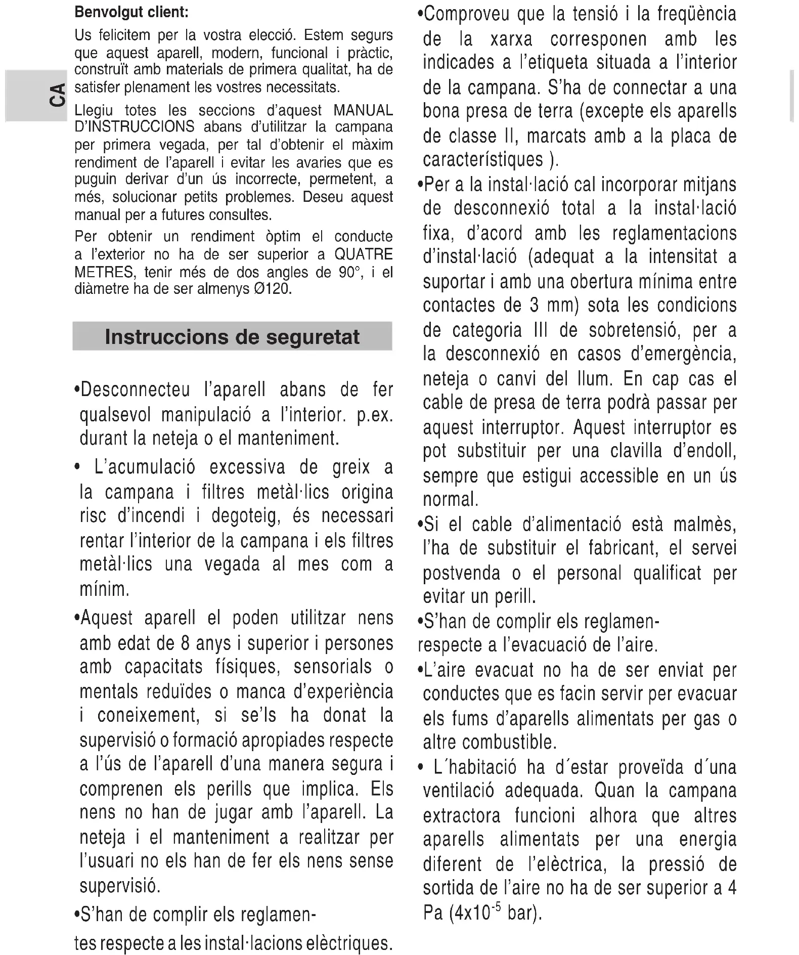 Benvolgut client: Us felicitem per la vostra elecció. Estem segurs que aquest aparell, modern, funcional i pràctic, construït amb materials de primera qualitat, ha de satisfer plenament les vostres necessitats. Llegiu totes les seccions d’aquest MANUAL D’INSTRUCCIONS abans d’utilitzar la campana per primera vegada, per tal d’obtenir el màxim rendiment de l’aparell i evitar les avaries que es puguin derivar d’un ús incorrecte, permetent, a més, solucionar petits problemes. Deseu aquest manual per a futures consultes. Per obtenir un rendiment òptim el conducte a l’exterior no ha de ser superior a QUATRE METRES, tenir més de dos angles de 90°, i el diàmetre ha de ser almenys Ø120.