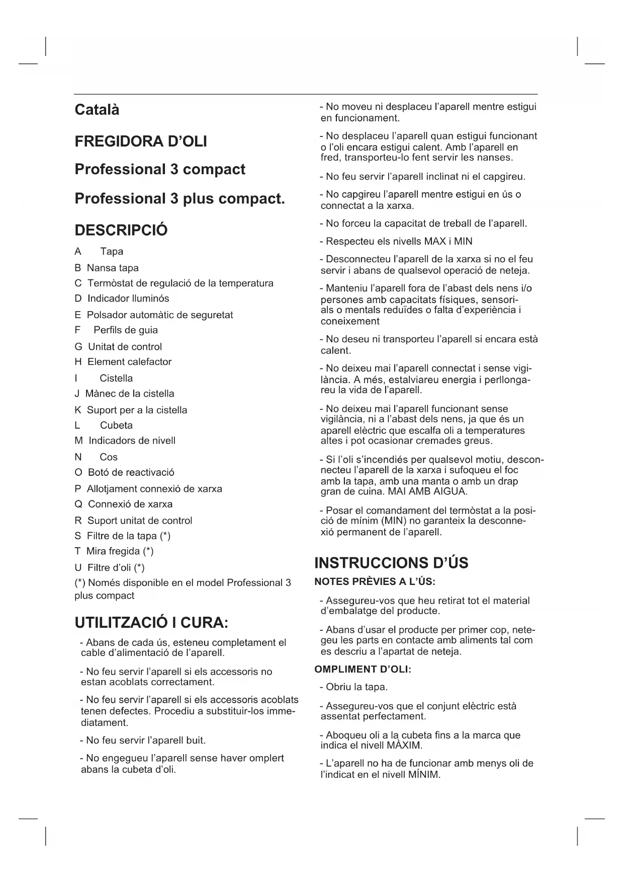 Professional 3 compact Professional 3 plus compact. DESCRIPCIÓ A Tapa B Nansa tapa C Termòstat de regulació de la temperatura D Indicador lluminós E Polsador automàtic de seguretat F Perlsdeguia G Unitat de control H Element calefactor I Cistella J Mànec de la cistella K Suport per a la cistella L Cubeta M Indicadors de nivell N Cos O Botó de reactivació P Allotjament connexió de xarxa Q Connexió de xarxa R Suport unitat de control S Filtre de la tapa (*) T Mira fregida (*) U Filtre d’oli (*) (*) Només disponible en el model Professional 3 plus compact UTILITZACIÓ I CURA: - Abans de cada ús, esteneu completament el cable d’alimentació de l’aparell. - No feu servir l’aparell si els accessoris no estan acoblats correctament. - No feu servir l’aparell si els accessoris acoblats tenen defectes. Procediu a substituir-los imme- diatament. - No feu servir l’aparell buit. - No engegueu l’aparell sense haver omplert abans la cubeta d’oli. - No moveu ni desplaceu l’aparell mentre estigui en funcionament. - No desplaceu l’aparell quan estigui funcionant o l’oli encara estigui calent. Amb l’aparell en fred, transporteu-lo fent servir les nanses. - No feu servir l’aparell inclinat ni el capgireu. - No capgireu l’aparell mentre estigui en ús o connectat a la xarxa. - No forceu la capacitat de treball de l’aparell. - Respecteu els nivells MAX i MIN - Desconnecteu l’aparell de la xarxa si no el feu servir i abans de qualsevol operació de neteja. - Manteniu l’aparell fora de l’abast dels nens i/o persones amb capacitats físiques, sensori- als o mentals reduïdes o falta d’experiència i coneixement - No deseu ni transporteu l’aparell si encara està calent. - No deixeu mai l’aparell connectat i sense vigi- lància. A més, estalviareu energia i perllonga- reu la vida de l’aparell. - No deixeu mai l’aparell funcionant sense vigilància, ni a l’abast dels nens, ja que és un aparell elèctric que escalfa oli a temperatures altes i pot ocasionar cremades greus. - Si l’oli s’incendiés per qualsevol motiu, descon- necteu l’aparell de la xarxa i sufoqueu el foc amb la tapa, amb una manta o amb un drap gran de cuina. MAI AMB AIGUA. - Posar el comandament del termòstat a la posi- ció de mínim (MIN) no garanteix la desconne- xió permanent de l’aparell.