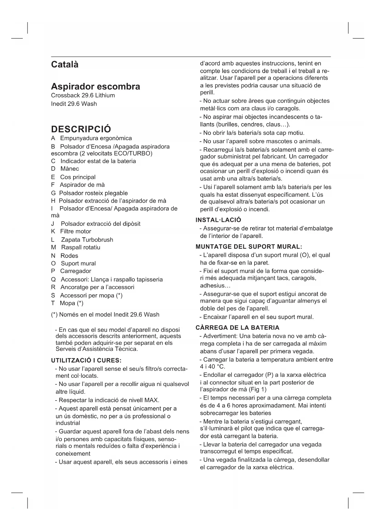 L’ASPIRADOR DE MÀ: - Pressionar el botó d’extracció de l’aspirador de mà (H) del cos principal (E ) de l’aspirador escombra. (Fig. 2) - L’aspirador de mà està dissenyat de tal forma que permet la inserció dels següents acces- soris: (usi la combinació que més s’ajusti a les seves necessitats). (Fig.3) - Filtre raspallo: dotada d’un raspall en la seva punta que permet, el raspallat de la superfície al mateix temps que s’actua. - Filtre llança: Especialment indicada per a ranu- res i racons de difícil accés. POSICIÓ DE PÀRQUING: - Aquest aparell disposa d’una posició de pàr- quing per a un fàcil i còmode magatzematge del producte. ANSA PLEGABLE: - Aquest aparell disposa d’una posició d’ansa ple- gable per a un fàcil magatzematge. (Fig.4) NETEJA - Desendollar el carregador elèctric de la xarxa i deixar-lo refredar abans d’iniciar qualsevol operació de neteja. - Netejar l’aparell amb un drap humit impreg- nat amb unes gotes de detergent i assecar-lo després. - No utilitzar dissolvents, ni productes amb un factor pH àcid o bàsic com el lleixiu, ni produc- tes abrasius, per a la neteja de l’aparell. - No submergir l’aparell en aigua o un altre líquid, ni posar-lo sota l’aixeta. BUIDATGE DEL DIPÒSIT DE POLS: - Buidar el dipòsit de pols quan s’apreciï a través de les seves parets transparents que estigui ple o bé quan es produeixi una reducció important de la potència d’aspiració de l’aparell. - Pressionar el botó d’extracció de l’aspirador de mà (H) del cos principal (E ) de l’aspirador escombra (Fig. 2) - Desacoblar el dipòsit pols de l’aparell (Fig. 5) - Extreure el ltre. (Fig. 6) - Abocar el contingut del dipòsit en un contenidor d’escombraries apropiat. - Netejar ltre diposito - Acoblar el dipòsit de pols a l’aparell. - Per al muntatge, procedeixi de manera inversa a l’explicat en els punts anteriors. CANVI DE FILTRES: - Per a la retirada dels ltres: - Pressionar el botó d’extracció de l’aspirador de mà (H) del cos principal (E ) de l’aspirador escombra. (Fig. 2) - Desacoblar el dipòsit pols de l’aparell (Fig 5) - Extreure el ltre. (Fig. 6) - Per al muntatge del ltre, procedeixi de manera inversa a l’explicat en l’apartat anterior. NETEJA DEL RASPALL ROTATIU: PER A LA RETIRADA DEL RASPALL: - En la part inferior de la sabata cal aixecar la pestanya per a desanclar el raspall. (Fig. 7) - Treure el raspall i netejar. - Per al muntatge procedeixi de manera inversa a l’explicat en els punts anteriors. CONSUMIBLES - En els distribuïdors i establiments autoritzats es podran adquirir els consumibles (com ara; ltres, … ) per al seu model d’aparell. - Usar sempre consumibles originals, dissenyats especícament per al seu model d’aparell.COM RETIRAR DE LES BATERIES DE L’INTERIOR DE L’APARELL: - Advertiment: És important que les bateries es trobin completament descarregades abans de procedir a la seva retirada de l’aparell. - Advertiment: l’aparell ha d’estar desconnectat de l’alimentació quan es retirin les bateries. - Per a retirar les bateries, una vegada nalitzada la vida de l’aparell, procedir com segueix: - Extregui amb seguretat la bateria del seu allotjament. - Extreure l’embellidor frontal. (Fig.8) - Llevar els 6 caragols que juntal les dues parts de l’aspirador de mà, per a accedir a la part interna. (Fig.8) - Desconnectar les connexions i llevar els 3 caragols que subjecten la bateria amb el motor. (Fig.8) Aquest aparell compleix amb la Directiva 2014/35/EU de Baixa Tensió, amb la Directiva 2014/30/EU de Compatibilitat Electromagnètica, amb la Directiva 2011/65/EU sobre restriccions a la utilització de determinades substàncies perilloses en aparells elèctrics i electrònics i amb la Directiva 2009/125/EC sobre els requisits de disseny ecològic aplicable als productes relacio- nats amb l’energia.Nederlands Steelstofzuiger Crossback 29.6 Lithium Inedit 29.6 Wash BESCHRIJVING A Ergonomisch handvat B Aan-/uitknop van de steelstofzuiger (2 standen,ECO/TURBO) C Indicator lading batterij D Handvat E Romp F Handzuiger G Knop uitklapbaar handvat H Knop voor de verwijdering van de handzuiger I Aan-/uitknop van de handzuiger J Knop voor het verwijderen van het stofreservoir K Motorlter L Houder Turbobrush M Roterende borstel N Wielen O Muursteun P Lader Q Accessoires: Spleetzuigmond en borstel voor stoering R Verankering van het hulpstuk S Mopbevestiging (*) T Zwabber (*) (*) Alleen op het Inedit 29.6 Wash-model - Mocht het model van uw apparaat niet bes- chikken over de hiervoor beschreven accessoi- res dan kunt u deze ook apart verkrijgen bij de Technische Hulpdienst. GEBRUIK EN ONDERHOUD: - Het apparaat niet gebruiken als de lter(s) niet correct geplaatst zijn. - Gebruik het apparaat niet voor het opzuigen van water of andere vloeistoen
