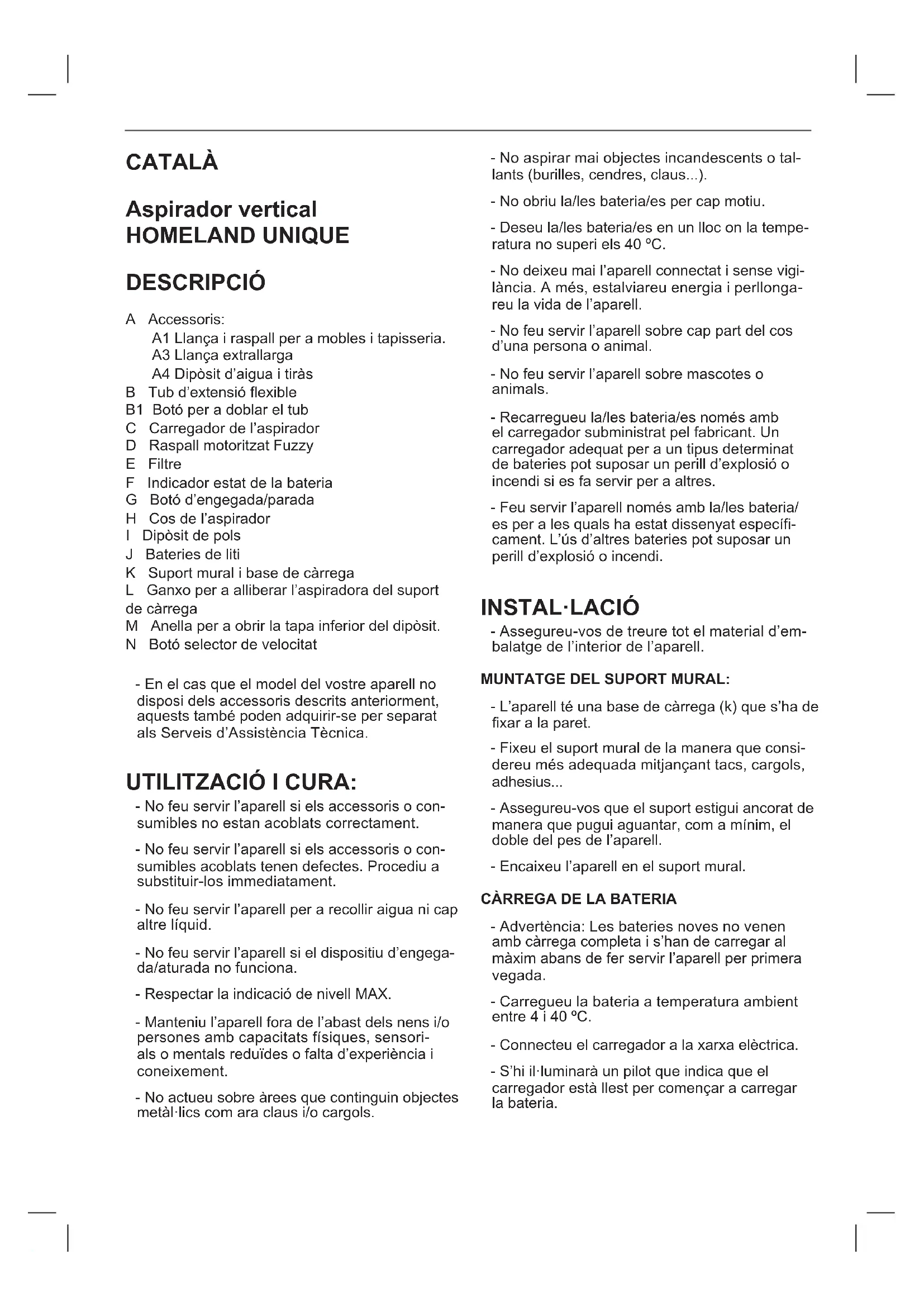 FORMA PARA REMOVER AS BATERIAS: - Retire a parte superior da peça principal do aparelho, a peça situada por cima da pega, para retirar a peça principal é necessário fazer alavanca com a peça inferior para libertar as patilhas de xação. (Fig.7). - Identique a bateria e corte os 4 cabos co- nectados à bateria. A m de evitar riscos de curto-circuito protega a parte condutora com ta isolante. (Fig.8) - Retire com segurança a bateria do seu aloja- mento.CATALÀ Aspirador vertical HOMELAND UNIQUE DESCRIPCIÓ A Accessoris: A1 Llança i raspall per a mobles i tapisseria. A3 Llança extrallarga A4 Dipòsit d’aigua i tiràs B Tub d’extensió exible B1 Botó per a doblar el tub C Carregador de l’aspirador D Raspall motoritzat Fuzzy E Filtre F Indicador estat de la bateria G Botó d’engegada/parada H Cos de l’aspirador I Dipòsit de pols J Bateries de liti K Suport mural i base de càrrega L Ganxo per a alliberar l’aspiradora del suport de càrrega M Anella per a obrir la tapa inferior del dipòsit. N Botó selector de velocitat - En el cas que el model del vostre aparell no disposi dels accessoris descrits anteriorment, aquests també poden adquirir-se per separat als Serveis d’Assistència Tècnica. UTILITZACIÓ I CURA: - No feu servir l’aparell si els accessoris o con- sumibles no estan acoblats correctament. - No feu servir l’aparell si els accessoris o con- sumibles acoblats tenen defectes. Procediu a substituir-los immediatament. - No feu servir l’aparell per a recollir aigua ni cap altre líquid. - No feu servir l’aparell si el dispositiu d’engega- da/aturada no funciona. - Respectar la indicació de nivell MAX. - Manteniu l’aparell fora de l’abast dels nens i/o persones amb capacitats físiques, sensori- als o mentals reduïdes o falta d’experiència i coneixement. - No actueu sobre àrees que continguin objectes metàl·lics com ara claus i/o cargols. - No aspirar mai objectes incandescents o tal- lants (burilles, cendres, claus...). - No obriu la/les bateria/es per cap motiu. - Deseu la/les bateria/es en un lloc on la tempe- ratura no superi els 40 ºC. - No deixeu mai l’aparell connectat i sense vigi- lància. A més, estalviareu energia i perllonga- reu la vida de l’aparell. - No feu servir l’aparell sobre cap part del cos d’una persona o animal. - No feu servir l’aparell sobre mascotes o animals. - Recarregueu la/les bateria/es només amb el carregador subministrat pel fabricant. Un carregador adequat per a un tipus determinat de bateries pot suposar un perill d’explosió o incendi si es fa servir per a altres. - Feu servir l’aparell només amb la/les bateria/ es per a les quals ha estat dissenyat especí- cament. L’ús d’altres bateries pot suposar un perill d’explosió o incendi. INSTAL·LACIÓ - Assegureu-vos de treure tot el material d’em- balatge de l’interior de l’aparell. MUNTATGE DEL SUPORT MURAL: - L’aparell té una base de càrrega (k) que s’ha de xar a la paret. - Fixeu el suport mural de la manera que consi- dereu més adequada mitjançant tacs, cargols, adhesius... - Assegureu-vos que el suport estigui ancorat de manera que pugui aguantar, com a mínim, el doble del pes de l’aparell. - Encaixeu l’aparell en el suport mural.