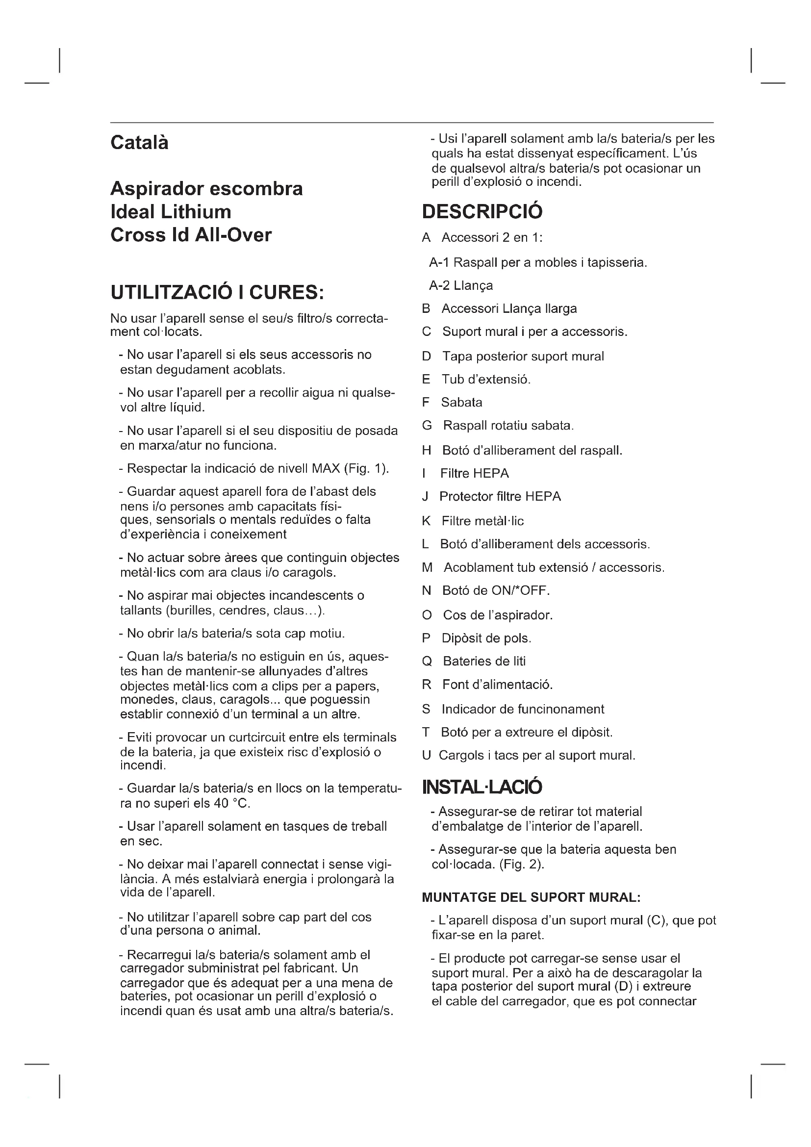 FORMA PARA REMOVER AS BATERIAS: - Puxeabateriaparacimaatéaretirardocom- partimento. (Fig. 11).Català Aspirador escombra Ideal Lithium Cross Id All-Over UTILITZACIÓ I CURES: No usar l’aparell sense el seu/s ltro/s correcta- ment col·locats. - No usar l’aparell si els seus accessoris no estan degudament acoblats. - No usar l’aparell per a recollir aigua ni qualse- vol altre líquid. - No usar l’aparell si el seu dispositiu de posada en marxa/atur no funciona. - Respectar la indicació de nivell MAX (Fig. 1). - Guardar aquest aparell fora de l’abast dels nens i/o persones amb capacitats físi- ques, sensorials o mentals reduïdes o falta d’experiència i coneixement - No actuar sobre àrees que continguin objectes metàl·lics com ara claus i/o caragols. - No aspirar mai objectes incandescents o tallants (burilles, cendres, claus…). - No obrir la/s bateria/s sota cap motiu. - Quan la/s bateria/s no estiguin en ús, aques- tes han de mantenir-se allunyades d’altres objectes metàl·lics com a clips per a papers, monedes, claus, caragols... que poguessin establir connexió d’un terminal a un altre. - Eviti provocar un curtcircuit entre els terminals de la bateria, ja que existeix risc d’explosió o incendi. - Guardar la/s bateria/s en llocs on la temperatu- ra no superi els 40 °C. - Usar l’aparell solament en tasques de treball en sec. - No deixar mai l’aparell connectat i sense vigi- lància. A més estalviarà energia i prolongarà la vida de l’aparell. - No utilitzar l’aparell sobre cap part del cos d’una persona o animal. - Recarregui la/s bateria/s solament amb el carregador subministrat pel fabricant. Un carregador que és adequat per a una mena de bateries, pot ocasionar un perill d’explosió o incendi quan és usat amb una altra/s bateria/s. - Usi l’aparell solament amb la/s bateria/s per les quals ha estat dissenyat especícament. L’ús de qualsevol altra/s bateria/s pot ocasionar un perill d’explosió o incendi. DESCRIPCIÓ A Accessori 2 en 1: A-1 Raspall per a mobles i tapisseria. A-2 Llança B Accessori Llança llarga C Suport mural i per a accessoris. D Tapa posterior suport mural E Tub d’extensió. F Sabata G Raspall rotatiu sabata. H Botó d’alliberament del raspall. I Filtre HEPA J Protector ltre HEPA K Filtre metàl·lic L Botó d’alliberament dels accessoris. M Acoblament tub extensió / accessoris. N Botó de ON/*OFF. O Cos de l’aspirador. P Dipòsit de pols. Q Bateries de liti R Font d’alimentació. S Indicador de funcinonament T Botó per a extreure el dipòsit. U Cargols i tacs per al suport mural. INSTAL·LACIÓ - Assegurar-se de retirar tot material d’embalatge de l’interior de l’aparell. - Assegurar-se que la bateria aquesta ben col·locada. (Fig. 2). MUNTATGE DEL SUPORT MURAL: - L’aparell disposa d’un suport mural (C), que pot xar-se en la paret. - El producte pot carregar-se sense usar el suport mural. Per a això ha de descaragolar la tapa posterior del suport mural (D) i extreure el cable del carregador, que es pot connectardirectament al cos de l’aspirador. - Fixi el suport mural de la forma que consideri més adequada mitjançant tacs, caragols, adhesius… - Assegurar-se que el suport estigui ancorat de manera que sigui capaç d’aguantar almenys el doble del pes de l’aparell. - Encaixar l’aparell en el seu suport mural.