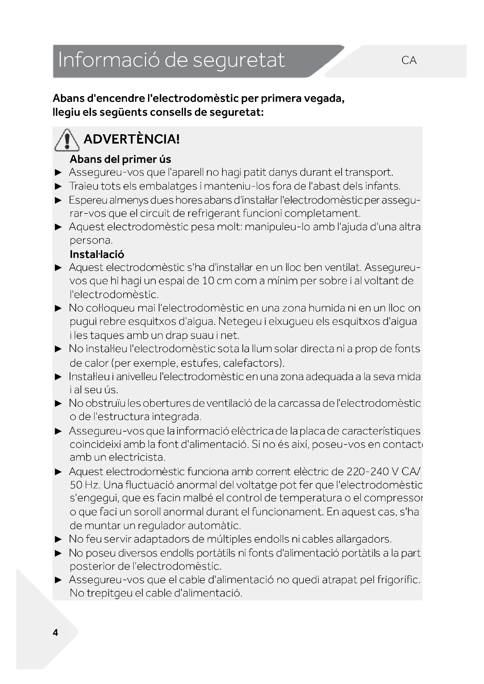 ADVERTÈNCIA! Abans del primer ús ► Assegureu-vos que l'aparell no hagi patit danys durant el transport. ► Traieu tots els embalatges i manteniu-los fora de l'abast dels infants. ► Espereu almenys dues hores abans d'instal·lar l'electrodomèstic per assegu- rar-vos que el circuit de refrigerant funcioni completament. ► Aquest electrodomèstic pesa molt: manipuleu-lo amb l'ajuda d'una altra persona. Instal·lació ► Aquest electrodomèstic s'ha d'instal·lar en un lloc ben ventilat. Assegureu- vos que hi hagi un espai de 10 cm com a mínim per sobre i al voltant de l'electrodomèstic. ► No col·loqueu mai l'electrodomèstic en una zona humida ni en un lloc on pugui rebre esquitxos d'aigua. Netegeu i eixugueu els esquitxos d'aigua i les taques amb un drap suau i net. ► No instal·leu l'electrodomèstic sota la llum solar directa ni a prop de fonts de calor (per exemple, estufes, calefactors). ► Instal·leu i anivelleu l'electrodomèstic en una zona adequada a la seva mida i al seu ús. ► No obstruïu les obertures de ventilació de la carcassa de l'electrodomèstic o de l'estructura integrada. ► Assegureu-vos que la informació elèctrica de la placa de característiques coincideixi amb la font d'alimentació. Si no és així, poseu-vos en contacte amb un electricista. ► Aquest electrodomèstic funciona amb corrent elèctric de 220-240 V CA/ 50 Hz. Una fluctuació anormal del voltatge pot fer que l'electrodomèstic no s'engegui, que es facin malbé el control de temperatura o el compressor, o que faci un soroll anormal durant el funcionament. En aquest cas, s'ha de muntar un regulador automàtic. ► No feu servir adaptadors de múltiples endolls ni cables allargadors. ► No poseu diversos endolls portàtils ni fonts d'alimentació portàtils a la part posterior de l'electrodomèstic. ► Assegureu-vos que el cable d'alimentació no quedi atrapat pel frigorífic. No trepitgeu el cable d'alimentació.CA Informació de seguretat