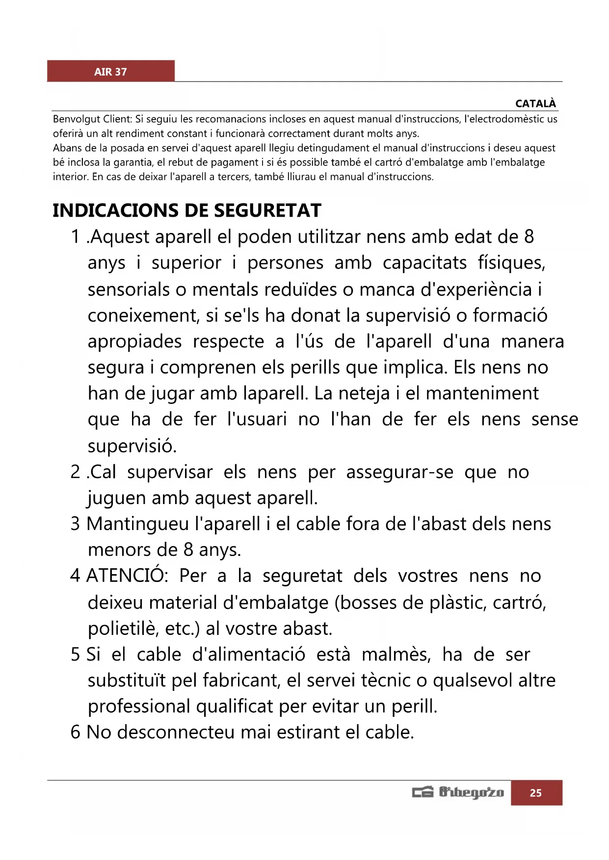 1 .Aquest aparell el poden utilitzar nens amb edat de 8 anys i superior i persones amb capacitats físiques, sensorials o mentals reduïdes o manca d'experiència i coneixement, si se'ls ha donat la supervisió o formació apropiades respecte a l'ús de l'aparell d'una manera segura i comprenen els perills que implica. Els nens no han de jugar amb laparell. La neteja i el manteniment que ha de fer l'usuari no l'han de fer els nens sense supervisió. 2 .Cal supervisar els nens per assegurar-se que no juguen amb aquest aparell. 3 Mantingueu l'aparell i el cable fora de l'abast dels nens menors de 8 anys. 4 ATENCIÓ: Per a la seguretat dels vostres nens no deixeu material d'embalatge (bosses de plàstic, cartró, polietilè, etc.) al vostre abast. 5 Si el cable d'alimentació està malmès, ha de ser substituït pel fabricant, el servei tècnic o qualsevol altre professional qualificat per evitar un perill. 6 No desconnecteu mai estirant el cable.AIR 37