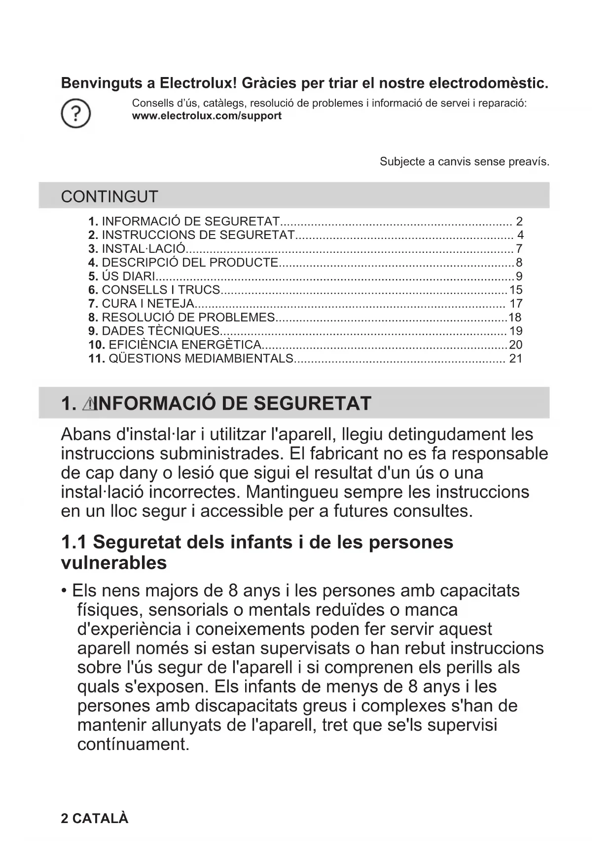 Recicleu els materials amb el símbol . Dipositeu l'embalatge en contenidors adequats per al seu posterior reciclatge. Ajudeu a protegir el medi ambient i la salut humana i a reciclar les deixalles procedents d'aparells elèctrics i electrònics. No llenceu a les escombraries domèstiques els aparells amb el símbol . Porteu el producte a les instal·lacions de reciclatge locals o poseu-vos en contacte amb la seva oficina municipal. CATALÀ 21Velkommen til Electrolux! Tak, fordi du valgte vores produkt. Table title.Få råd om brug, brochurer, fejlfinding, service- og reparationsinformation:www.electrolux.com/supportRet til ændringer uden varsel forbeholdes. INDHOLDSFORTEGNELSE