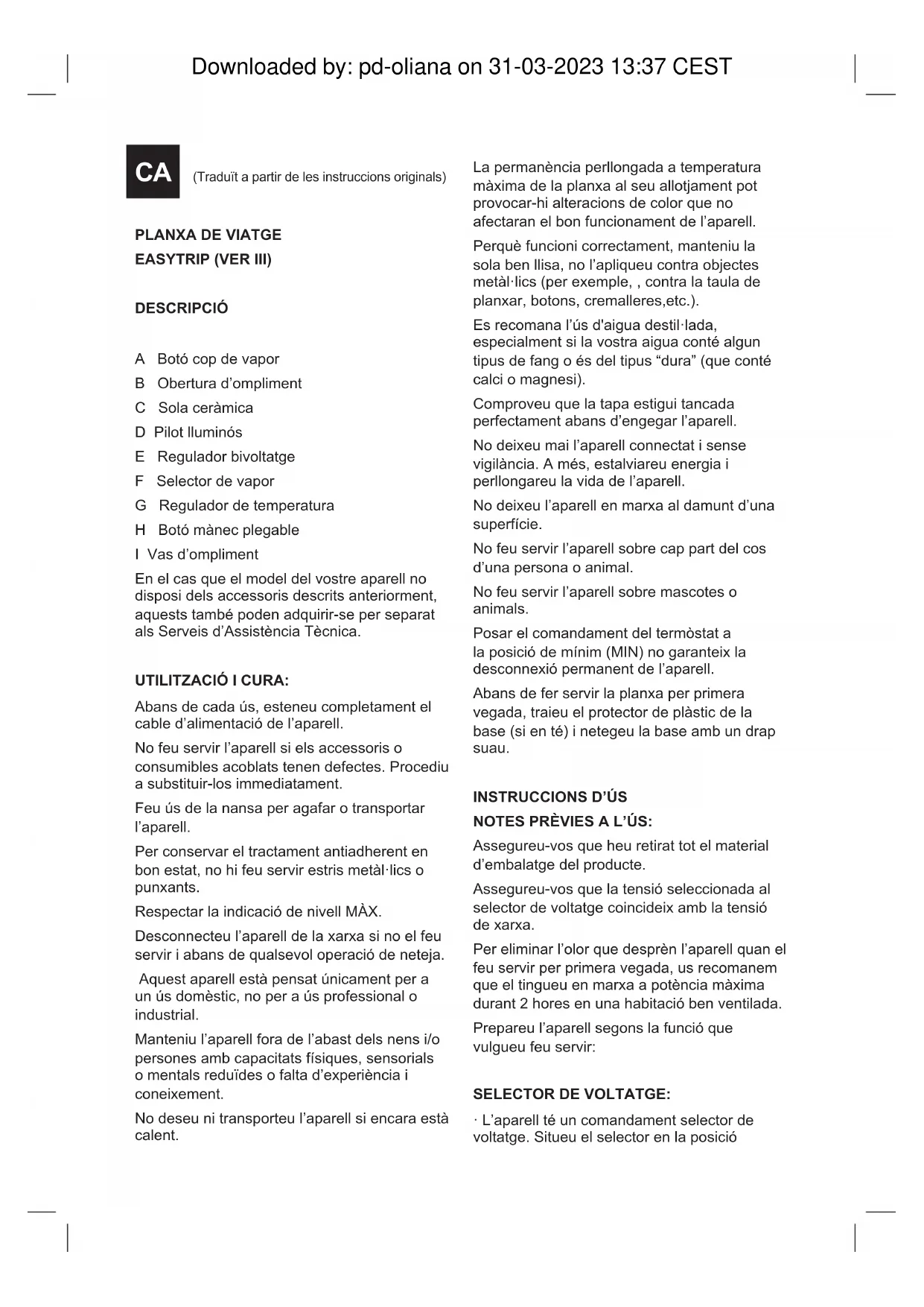 CALCAREE: Per un corretto funzionamento dell’apparecchio, evitare la formazione di incrostazioni di calcio o magnesio causate dall’uso di acqua ad elevata durezza. Per evitare questo tipo di problema si raccomanda l'uso di acqua distillata o acqua puricata. In ogni caso, se non è possibile usare il tipo d’acqua raccomandato, si consiglia di eseguire periodicamente un procedimento di decalcicazione dell’apparecchio: Ogni 6 settimane se l’acqua è “molto dura”. Ogni 12 settimane se l’acqua è “dura”. Per la decalcicazione dell’apparecchio si raccomanda di usare un prodotto specico, in vendita nei negozi specializzati e nei punti d’assistenza tecnica autorizzati. Downloaded by: pd-oliana on 31-03-2023 13:37 CESTPLANXA DE VIATGE EASYTRIP (VER III) DESCRIPCIÓ A Botó cop de vapor B Obertura d’ompliment C Sola ceràmica D Pilot lluminós E Regulador bivoltatge F Selector de vapor G Regulador de temperatura H Botó mànec plegable I Vas d’ompliment En el cas que el model del vostre aparell no disposi dels accessoris descrits anteriorment, aquests també poden adquirir-se per separat als Serveis d’Assistència Tècnica. UTILITZACIÓ I CURA: Abans de cada ús, esteneu completament el cable d’alimentació de l’aparell. No feu servir l’aparell si els accessoris o consumibles acoblats tenen defectes. Procediu a substituir-los immediatament. Feu ús de la nansa per agafar o transportar l’aparell. Per conservar el tractament antiadherent en bon estat, no hi feu servir estris metàl·lics o punxants. Respectar la indicació de nivell MÀX. Desconnecteu l’aparell de la xarxa si no el feu servir i abans de qualsevol operació de neteja. Aquest aparell està pensat únicament per a un ús domèstic, no per a ús professional o industrial. Manteniu l’aparell fora de l’abast dels nens i/o persones amb capacitats físiques, sensorials o mentals reduïdes o falta d’experiència i coneixement. No deseu ni transporteu l’aparell si encara està calent. La permanència perllongada a temperatura màxima de la planxa al seu allotjament pot provocar-hi alteracions de color que no afectaran el bon funcionament de l’aparell. Perquè funcioni correctament, manteniu la sola ben llisa, no l’apliqueu contra objectes metàl·lics (per exemple, , contra la taula de planxar, botons, cremalleres,etc.). Es recomana l’ús d'aigua destil·lada, especialment si la vostra aigua conté algun tipus de fang o és del tipus “dura” (que conté calci o magnesi). Comproveu que la tapa estigui tancada perfectament abans d’engegar l’aparell. No deixeu mai l’aparell connectat i sense vigilància. A més, estalviareu energia i perllongareu la vida de l’aparell. No deixeu l’aparell en marxa al damunt d’una superfície. No feu servir l’aparell sobre cap part del cos d’una persona o animal. No feu servir l’aparell sobre mascotes o animals. Posar el comandament del termòstat a la posició de mínim (MIN) no garanteix la desconnexió permanent de l’aparell. Abans de fer servir la planxa per primera vegada, traieu el protector de plàstic de la base (si en té) i netegeu la base amb un drap suau.