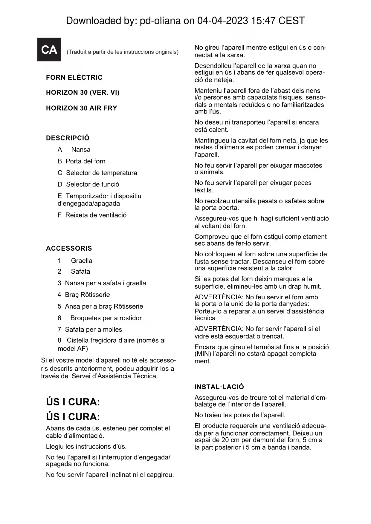 DESCRIPCIÓ A Nansa B Porta del forn C Selector de temperatura D Selector de funció E Temporitzador i dispositiu d’engegada/apagada F Reixeta de ventilació ACCESSORIS 1 Graella 2 Safata 3 Nansa per a safata i graella 4 Braç Rôtisserie 5 Ansa per a braç Rôtisserie 6 Broquetes per a rostidor 7 Safata per a molles 8 Cistella fregidora d’aire (només al model AF) Si el vostre model d’aparell no té els accesso- ris descrits anteriorment, podeu adquirir-los a través del Servei d’Assistència Tècnica. ÚS I CURA: ÚS I CURA: Abans de cada ús, esteneu per complet el cable d’alimentació. Llegiu les instruccions d’ús. No feu l’aparell si l’interruptor d’engegada/ apagada no funciona. No feu servir l’aparell inclinat ni el capgireu. No gireu l’aparell mentre estigui en ús o con- nectat a la xarxa. Desendolleu l’aparell de la xarxa quan no estigui en ús i abans de fer qualsevol opera- ció de neteja. Manteniu l’aparell fora de l’abast dels nens i/o persones amb capacitats físiques, senso- rials o mentals reduïdes o no familiaritzades amb l’ús. No deseu ni transporteu l’aparell si encara està calent. Mantingueu la cavitat del forn neta, ja que les restes d’aliments es poden cremar i danyar l’aparell. No feu servir l’aparell per eixugar mascotes o animals. No feu servir l’aparell per eixugar peces tèxtils. No recolzeu utensilis pesats o safates sobre la porta oberta. Assegureu-vos que hi hagi sucient ventilació al voltant del forn. Comproveu que el forn estigui completament sec abans de fer-lo servir. No col·loqueu el forn sobre una superfície de fusta sense tractar. Descanseu el forn sobre una superfície resistent a la calor. Si les potes del forn deixin marques a la superfície, elimineu-les amb un drap humit. ADVERTÈNCIA: No feu servir el forn amb la porta o la unió de la porta danyades: Porteu-lo a reparar a un servei d’assistència tècnica ADVERTÈNCIA: No fer servir l’aparell si el vidre està esquerdat o trencat. Encara que gireu el termòstat ns a la posició (MIN) l’aparell no estarà apagat completa- ment. INSTAL·LACIÓ Assegureu-vos de treure tot el material d’em- balatge de l’interior de l’aparell. No traieu les potes de l’aparell. El producte requereix una ventilació adequa- da per a funcionar correctament. Deixeu un espai de 20 cm per damunt del forn, 5 cm a la part posterior i 5 cm a banda i banda. CA (Traduït a partir de les instruccions originals) Downloaded by: pd-oliana on 04-04-2023 15:47 CESTINSTRUCCIONS D’ÚS ABANS DEL PRIMER ÚS: Assegureu-vos que heu retirat el material d’embalatge del producte. Abans de fer servir el producte per primera vegada, renteu les parts que vagin a entrar en contacte amb els aliments, tal com descriu l’apartat de Neteja. ÚS: Connecteu l’aparell a la xarxa elèctrica. Seleccioneu la temperatura amb el selector de temperatura. (C) Seleccionar la funció a realitzar mitjançant el selector de funcions (D) SELECTOR DE FUNCIONS (D) ► Apagada ► Cuinar amb convecció. Aquesta funció permet cuinar amb les resistències inferior i superior, mantenir una temperatura uniforme i escurçar el temps de cuinat gràcies a l’aire de convecció. ► Grill amb convecció. Feu servir aques- ta funció per a gratinar els aliments mentre la convecció reparteix la calor a l’aliment mateix. ► Cuinat tradicional. Seleccioneu aques- ta funció per cuinar els aliments de la manera tradicional. ► Grill / Grill amb rostidor. Feu servir aquesta funció per a gratinar els aliments de manera tradicional o feu servir els accessoris del rostidor per a fer servir la calor superior amb el rostidor. ► Rostidor (rostit) amb convecció. Selec- cioneu aquesta funció per rostir els aliments i cuinar-los amb l’ajuda de la convecció. Feu servir també aquesta funció per a fregir els aliments amb ajuda de la cistella AIR FRY.