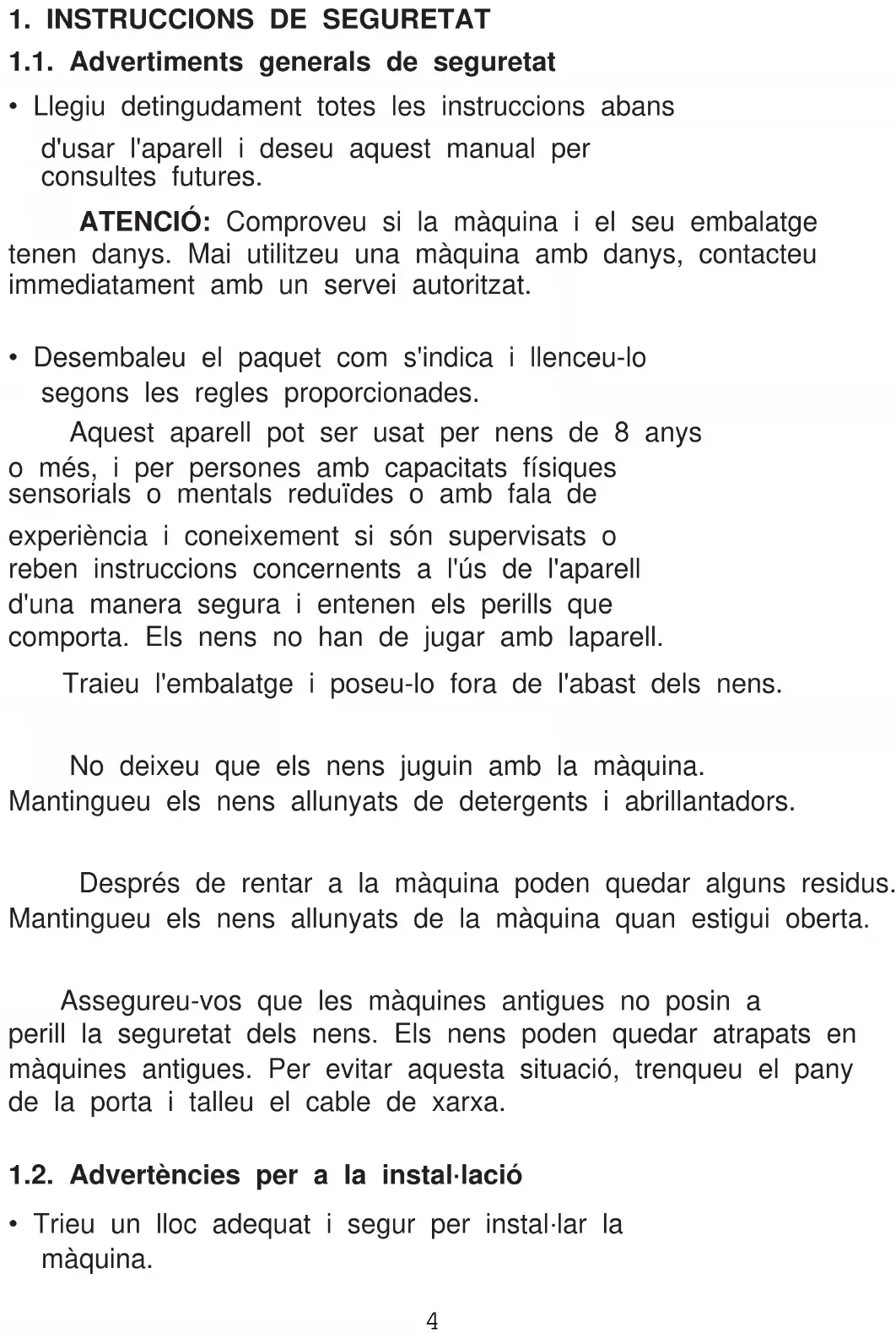 - Trieu un lloc adequat i segur per instal·lar la d'usar l'aparell i deseu aquest manual per reben instruccions concernents a l'ús de l'aparell 1.2. Advertències per a la instal·lació màquina.