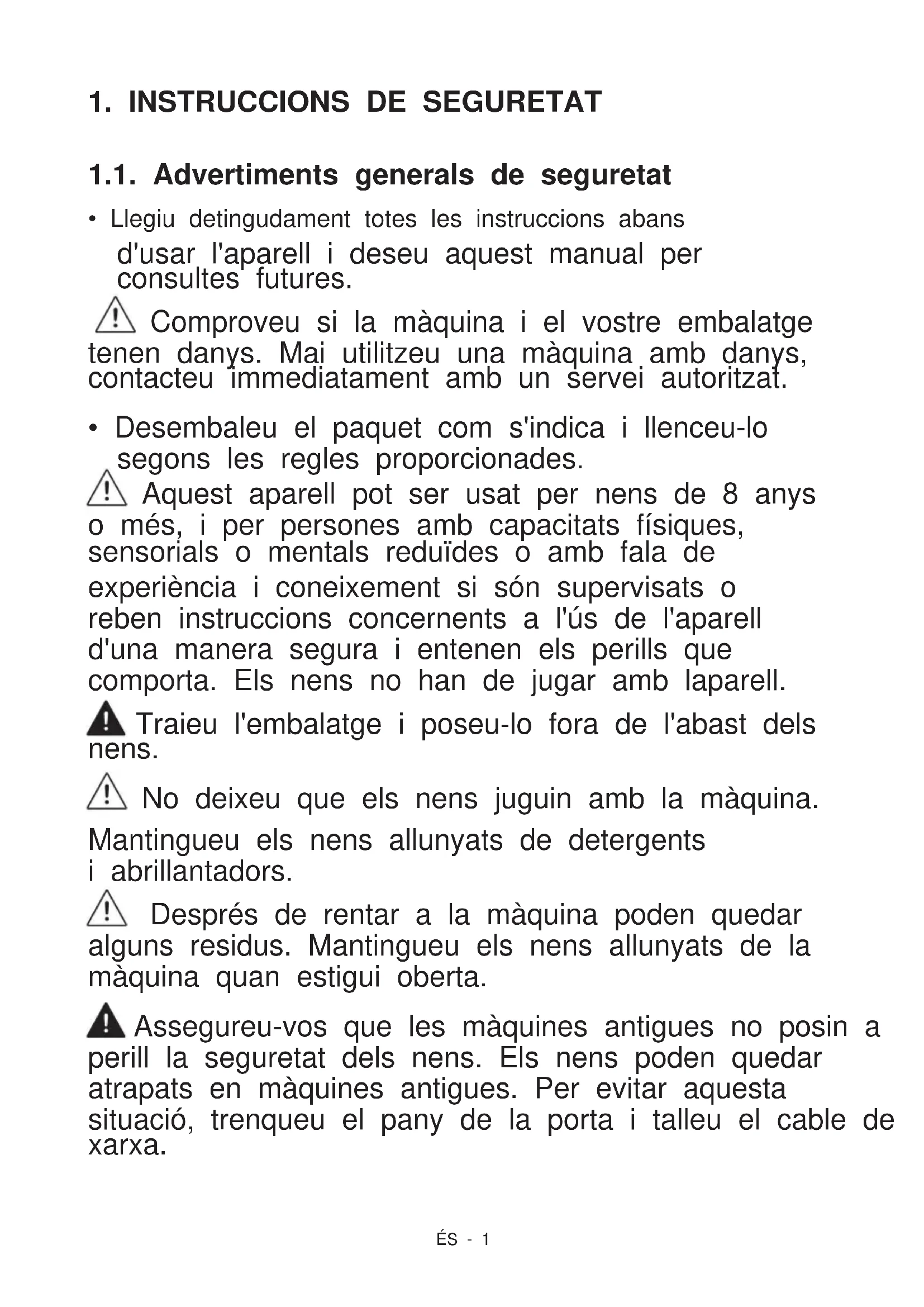 - Llegiu detingudament totes les instruccions abans Assegureu-vos que les màquines antigues no posin a sensorials o mentals reduïdes o amb fala de 1.1. Advertiments generals de seguretat Després de rentar a la màquina poden quedar alguns residus. Mantingueu els nens allunyats de la màquina quan estigui oberta. i abrillantadors. o més, i per persones amb capacitats físiques,