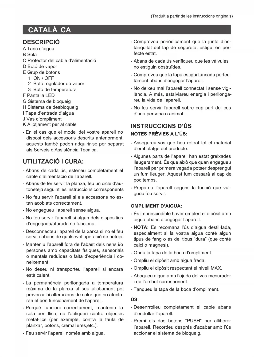 - En el cas que el model del vostre aparell no disposi dels accessoris descrits anteriorment, aquests també poden adquirir-se per separat als Serveis d’Assistència Tècnica. UTILITZACIÓ I CURA: