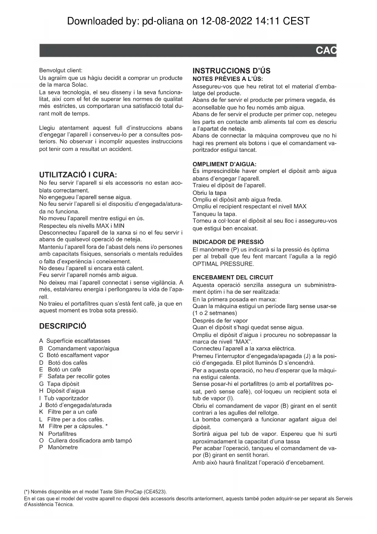- Dit symbool betekent dat u het product aan het eind van zijn levenscyclus moet afgeven aan een erkende afvalverwerker ten behoeve van de gescheiden verwerking van Afgedankte Elektrische en Elektronische Appa- ratuur (AEEA). Dit apparaat voldoet aan de laagspanningsrichtlijn 2014/35/EU, de richtlijn 2014/30/EU met betrekking tot ele- ktromagnetische compatibiliteit, de richtlijn 2011/65/EU met betrekking tot beperkingen in de toepassing van bepaalde gevaarlijke stoen in elektrische en elektronische apparaten en de richtlijn 2009/125/EG met betrekking tot de eisen inzake het ecologisch ontwerp van energie-gerelateerde producten. Downloaded by: pd-oliana on 12-08-2022 14:11 CESTUTILITZACIÓ I CURA: No feu servir l’aparell si els accessoris no estan aco- blats correctament. No engegueu l’aparell sense aigua. No feu servir l’aparell si el dispositiu d’engegada/atura- da no funciona. No moveu l’aparell mentre estigui en ús. Respecteu els nivells MAX i MIN Desconnecteu l’aparell de la xarxa si no el feu servir i abans de qualsevol operació de neteja. Manteniu l’aparell fora de l’abast dels nens i/o persones amb capacitats físiques, sensorials o mentals reduïdes o falta d’experiència i coneixement. No deseu l’aparell si encara està calent. Feu servir l’aparell només amb aigua. No deixeu mai l’aparell connectat i sense vigilància. A més, estalviareu energia i perllongareu la vida de l’apa- rell. No traieu el portaltres quan s’està fent cafè, ja que en aquest moment es troba sota pressió. DESCRIPCIÓ A Superfície escalfatasses B Comandament vapor/aigua C Botó escalfament vapor D Botó dos cafès E Botó un cafè F Safata per recollir gotes G Tapa dipòsit H Dipòsit d’aigua I Tub vaporitzador J Botó d’engegada/aturada K Filtre per a un cafè L Filtre per a dos cafès. M Filtre per a càpsules. * N Portaltres O Cullera dosicadora amb tampó P Manòmetre (*) Només disponible en el model Taste Slim ProCap (CE4523). En el cas que el model del vostre aparell no disposi dels accessoris descrits anteriorment, aquests també poden adquirir-se per separat als Serveis d’Assistència Tècnica. Benvolgut client: Us agraïm que us hàgiu decidit a comprar un producte de la marca Solac. La seva tecnologia, el seu disseny i la seva funciona- litat, així com el fet de superar les normes de qualitat més estrictes, us comportaran una satisfacció total du- rant molt de temps. Llegiu atentament aquest full d’instruccions abans d’engegar l’aparell i conserveu-lo per a consultes pos- teriors. No observar i incomplir aquestes instruccions pot tenir com a resultat un accident.