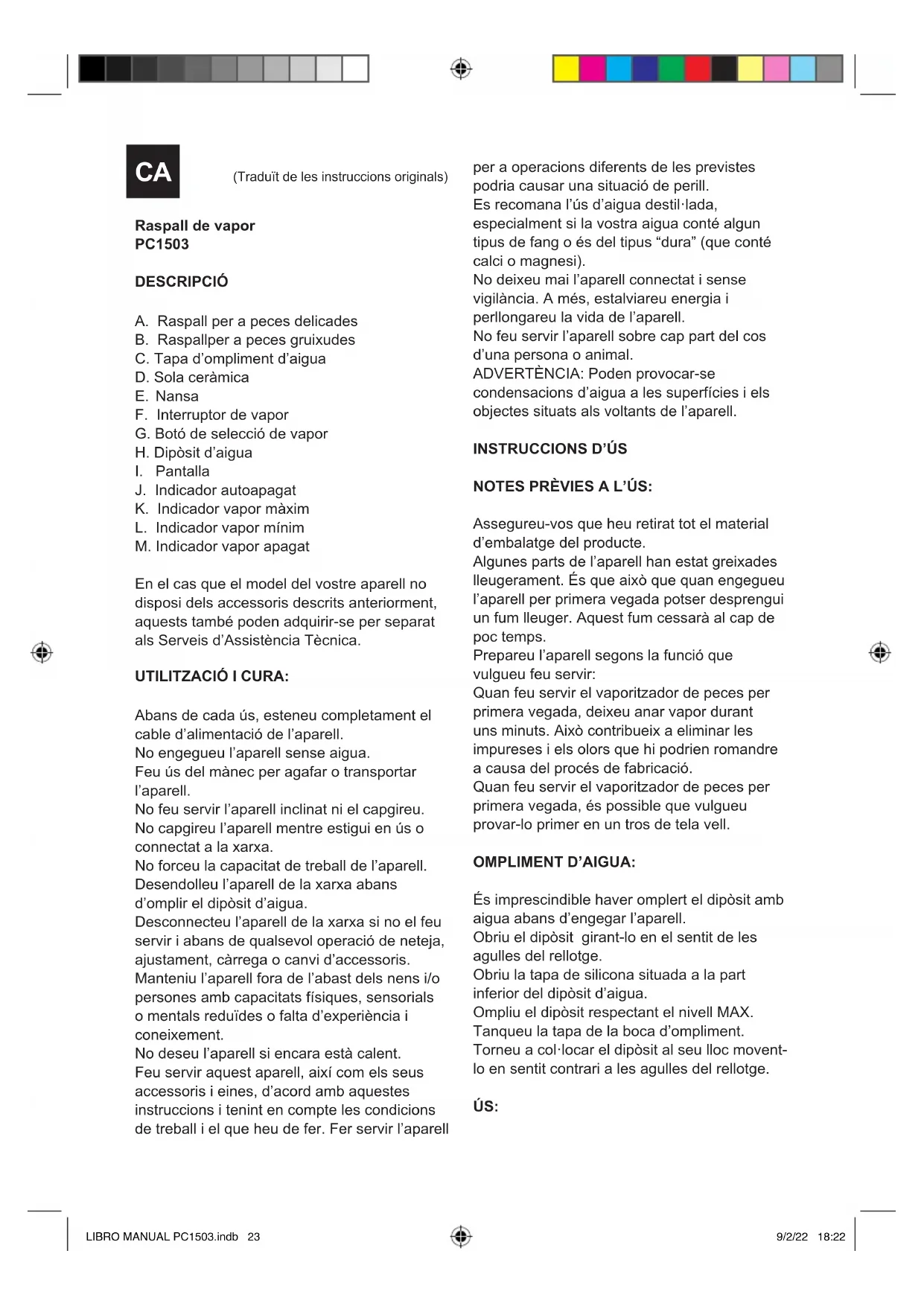 NOTES PRÈVIES A L’ÚS: Assegureu-vos que heu retirat tot el material d’embalatge del producte. Algunes parts de l’aparell han estat greixades lleugerament. És que això que quan engegueu l’aparell per primera vegada potser desprengui un fum lleuger. Aquest fum cessarà al cap de poc temps. Prepareu l’aparell segons la funció que vulgueu feu servir: Quan feu servir el vaporitzador de peces per primera vegada, deixeu anar vapor durant uns minuts. Això contribueix a eliminar les impureses i els olors que hi podrien romandre a causa del procés de fabricació. Quan feu servir el vaporitzador de peces per primera vegada, és possible que vulgueu provar-lo primer en un tros de tela vell. OMPLIMENT D’AIGUA: És imprescindible haver omplert el dipòsit amb aigua abans d’engegar l’aparell. Obriu el dipòsit girant-lo en el sentit de les agulles del rellotge. Obriu la tapa de silicona situada a la part inferior del dipòsit d’aigua. Ompliu el dipòsit respectant el nivell MAX. Tanqueu la tapa de la boca d’ompliment. Torneu a col·locar el dipòsit al seu lloc movent- lo en sentit contrari a les agulles del rellotge. ÚS: CA (Traduït de les instruccions originals) LIBRO MANUAL PC1503.indb 23LIBRO MANUAL PC1503.indb 23 9/2/22 18:229/2/22 18:22Esteneu completament el cable abans d’endollar-lo. Connecteu l’aparell a la xarxa elèctrica. Premeu el botó selector de vapor i escolliu entre les posicions “Sense Vapor”, “ECO” i “MAX”. L’indicador parpellejarà ns a assolit la temperatura desitjada. Premeu el botó de vapor per començar a vaporitzar. NOTA: No cal mantenir el botó premut per tenir vapor. Quan ja no vulgueu més vapor, premeu de nou el botó de vapor perquè acabi de vaporitzar. Orienteu l’aparell per dirigir el ux de vapor a la direcció desitjada. NOTA: Si no es canvia el mode, cada 25 segons el producte emetrà un vapor. VAPORITZAR PECES: El vaporitzador de peces és fàcil d’usar i és perfecte per a eliminar arrugues o plecs de la roba i de les cortines, així com revitalitzar els tèxtils de la llar. Es pot fer servir en la majoria de teixits, sempre que la peça estigui penjada o on una posició en què el vaporitzador pugui ser utilitzat fàcilment en una posició vertical, movent-lo sobre la peça en un moviment ascendent i descendent. NOTA: el vaporitzador de peces està dissenyat per a ser utilitzat en una posició vertical sobre peces penjades. Absteniu-vos de fer servir el vaporitzador en peces col·locades en una posició horitzontal. Pengeu la peça d’una perxa i estireu lleugerament la tela amb una mà. Comproveu que hi hagi ventilació darrere de la tela. Comproveu que les butxaques de la peça estiguin buides. NOTA: Es recomana no vaporitzar sobre accessoris de metall. Actueu amb cura i vaporitzeu al voltant dels accessoris de metall. Vaporitzar cortines
