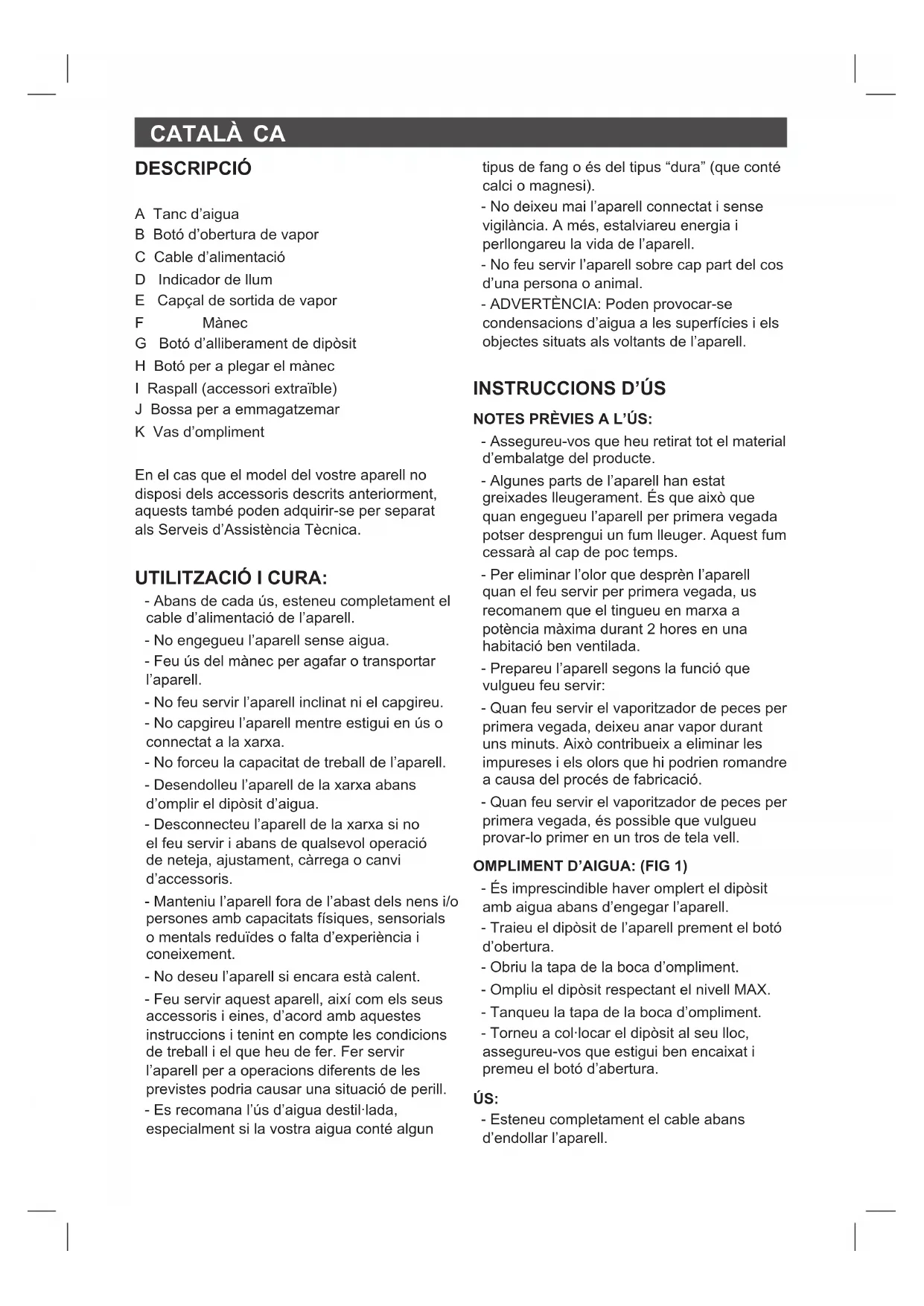 Non si pro- duce vapore Il vaporizza- tore non è acceso Premere il pulsante vapore Il vaporizza- tore non si riscalda Il vaporizza- tore non è acceso Inserire la spina nella presa di corrente Non si pro- duce vapore Il livello dell’acqua è troppo basso Scollegare il prodotto dalla corren- te e riempire nuovamente il serbatoio dell’acqua Rendimento del vapore deciente Sedimenti nel serba- toio Decalcicare il serbatoio dell’acquaCATALÀ CA DESCRIPCIÓ A Tanc d’aigua B Botó d’obertura de vapor C Cable d’alimentació D Indicador de llum E Capçal de sortida de vapor F Mànec G Botó d’alliberament de dipòsit H Botó per a plegar el mànec I Raspall (accessori extraïble) J Bossa per a emmagatzemar K Vas d’ompliment En el cas que el model del vostre aparell no disposi dels accessoris descrits anteriorment, aquests també poden adquirir-se per separat als Serveis d’Assistència Tècnica. UTILITZACIÓ I CURA: - Abans de cada ús, esteneu completament el cable d’alimentació de l’aparell. - No engegueu l’aparell sense aigua. - Feu ús del mànec per agafar o transportar l’aparell. - No feu servir l’aparell inclinat ni el capgireu. - No capgireu l’aparell mentre estigui en ús o connectat a la xarxa. - No forceu la capacitat de treball de l’aparell. - Desendolleu l’aparell de la xarxa abans d’omplir el dipòsit d’aigua. - Desconnecteu l’aparell de la xarxa si no el feu servir i abans de qualsevol operació de neteja, ajustament, càrrega o canvi d’accessoris. - Manteniu l’aparell fora de l’abast dels nens i/o persones amb capacitats físiques, sensorials o mentals reduïdes o falta d’experiència i coneixement. - No deseu l’aparell si encara està calent. - Feu servir aquest aparell, així com els seus accessoris i eines, d’acord amb aquestes instruccions i tenint en compte les condicions de treball i el que heu de fer. Fer servir l’aparell per a operacions diferents de les previstes podria causar una situació de perill. - Es recomana l’ús d’aigua destil·lada, especialment si la vostra aigua conté algun tipus de fang o és del tipus “dura” (que conté calci o magnesi). - No deixeu mai l’aparell connectat i sense vigilància. A més, estalviareu energia i perllongareu la vida de l’aparell. - No feu servir l’aparell sobre cap part del cos d’una persona o animal. - ADVERTÈNCIA: Poden provocar-se condensacions d’aigua a les superfícies i els objectes situats als voltants de l’aparell.