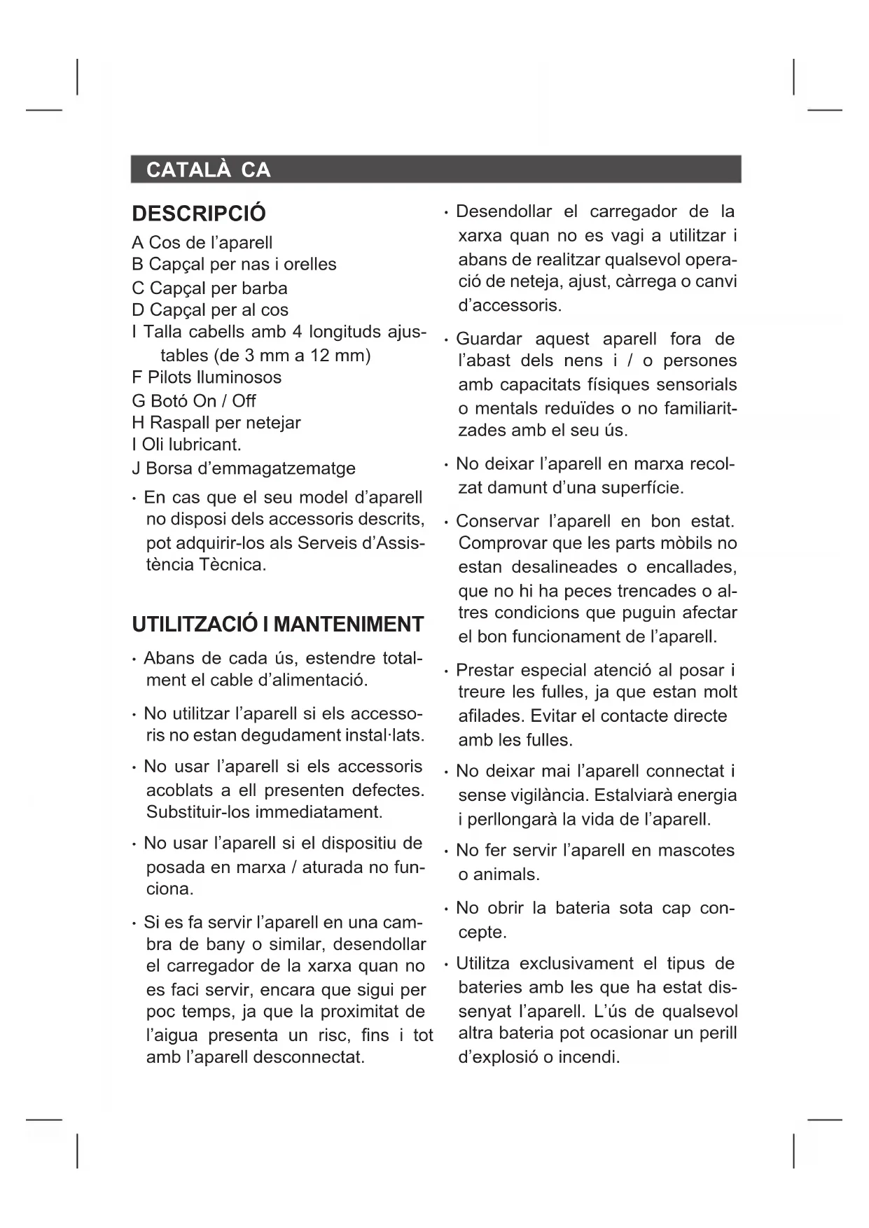 - Extraia com segurança a bateria do seu alojamento.CATALÀ CA DESCRIPCIÓ A Cos de l’aparell B Capçal per nas i orelles C Capçal per barba D Capçal per al cos I Talla cabells amb 4 longituds ajus- tables (de 3 mm a 12 mm) F Pilots lluminosos G Botó On / Off H Raspall per netejar I Oli lubricant. J Borsa d’emmagatzematge