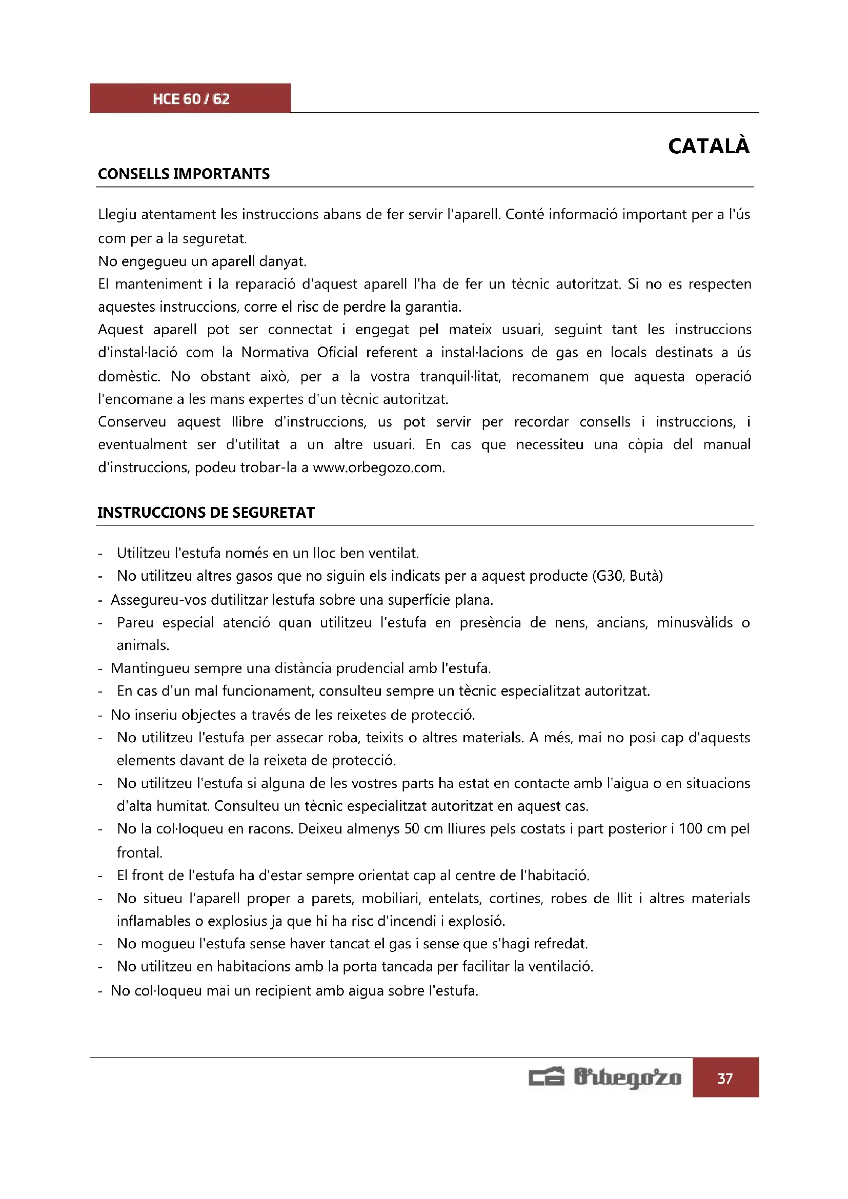CATALÀ CONSELLS IMPORTANTS Llegiu atentament les instruccions abans de fer servir l'aparell. Conté informació important per a l'ús com per a la seguretat. No engegueu un aparell danyat. El manteniment i la reparació d'aquest aparell l'ha de fer un tècnic autoritzat. Si no es respecten aquestes instruccions, corre el risc de perdre la garantia. Aquest aparell pot ser connectat i engegat pel mateix usuari, seguint tant les instruccions d'instal·lació com la Normativa Oficial referent a instal·lacions de gas en locals destinats a ús domèstic. No obstant això, per a la vostra tranquil·litat, recomanem que aquesta operació l'encomane a les mans expertes d'un tècnic autoritzat. Conserveu aquest llibre d'instruccions, us pot servir per recordar consells i instruccions, i eventualment ser d'utilitat a un altre usuari. En cas que necessiteu una còpia del manual d'instruccions, podeu trobar-la a www.orbegozo.com.