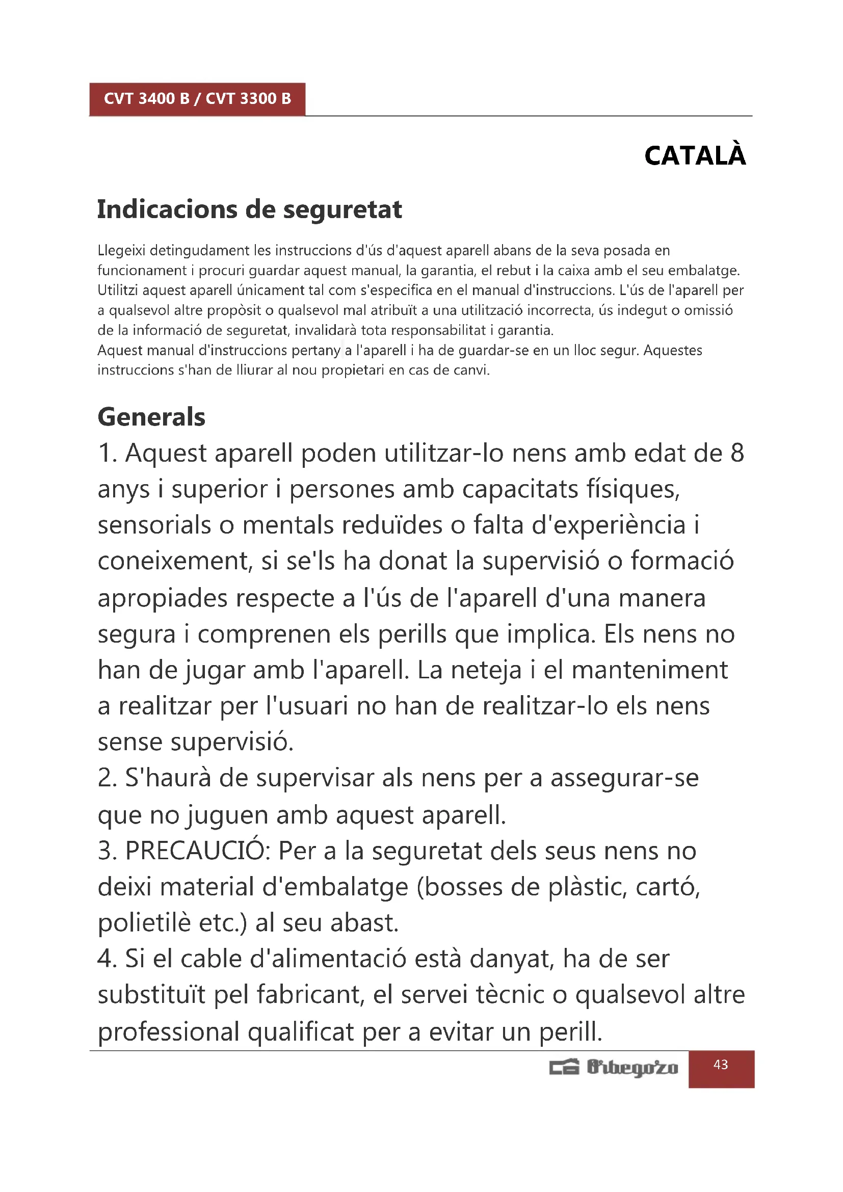 ELIMINACIÓ DE L'ELECTRODOMÈSTIC VELL. En base a la Norma europea 2012/19/UE de Residus d'aparells Elèctrics i Electrònics (RAEE), els electrodomèstics vells no poden ser llençats als contenidors municipals habituals; han de ser recollits selectivament per optimitzar la recuperació i el reciclatge dels components i materials que els constitueixen, i reduir l'impacte en la salut humana i el medi ambient. El símbol del contenidor d’escombraries es marca sobre tots els productes per recordar al consumidor l'obligació de separar-los per a la recollida selectiva. El consumidor ha de contactar amb l'autoritat local o amb el venedor per informar-se sobre la correcta eliminació del seu electrodomèstic vell. DECLARACIÓ DE CONFORMITAT: Aquest dispositiu compleix els requisits de la Directiva de Baixa Tensió 2014/35/EU i els requisits de la directiva de Compatibilitat Electromagnètica 2014/30/EU. GARANTIA Aquest aparell està cobert i compta amb el dret de la garantia legal d'acord amb la legislació vigent des de la data de compra. Conserveu el tiquet de compra per poder reclamar el vostre dret a la garantia. Per trobar el servei més proper a la seva localització contacteu a través del següent enllaç web: https://orbegozo.com/asistencia-tecnica/ Per a qualsevol tipus de consulta, dubte o incidència podeu posar-vos en contacte amb nosaltres a través del nostre correu electrònic reflectit a la pàgina principal d'aquest manual o a través del nostre servei d'assistència tècnica a https://orbegozo.com/contacto/ Orbegozo no es fa responsable dels components i accessoris que són objecte de desgast a causa de l'ús, així com els compostos peribles o que s'hagin deteriorat per un ús indegut. Tampoc no se'n farà responsable si el propietari ha modificat tècnicament l'aparell. Consulteu les condicions legals a la nostra pàgina web.CVT 3400 B / CVT 3300 B