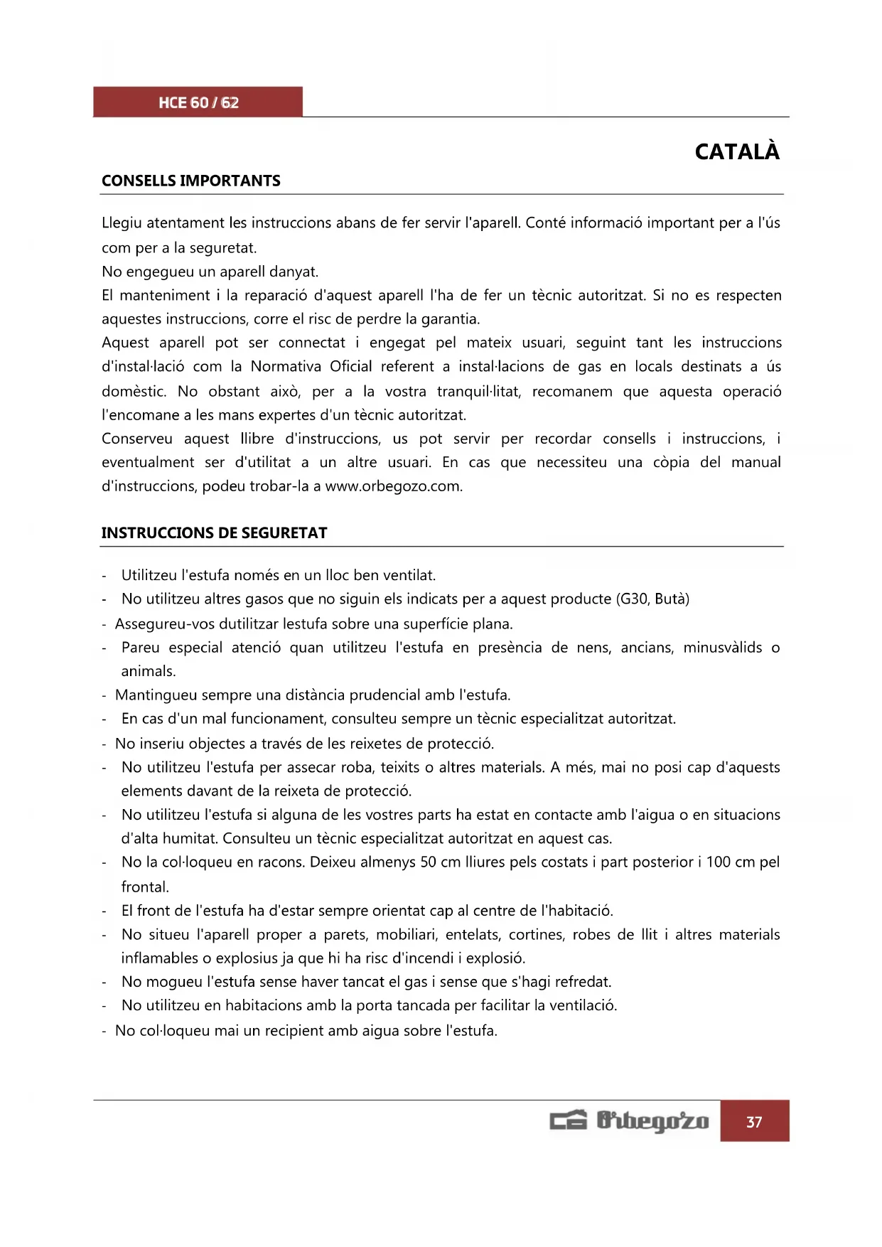 CATALÀ CONSELLS IMPORTANTS Llegiu atentament les instruccions abans de fer servir l'aparell. Conté informació important per a l'ús com per a la seguretat. No engegueu un aparell danyat. El manteniment i la reparació d'aquest aparell l'ha de fer un tècnic autoritzat. Si no es respecten aquestes instruccions, corre el risc de perdre la garantia. Aquest aparell pot ser connectat i engegat pel mateix usuari, seguint tant les instruccions d'instal·lació com la Normativa Oficial referent a instal·lacions de gas en locals destinats a ús domèstic. No obstant això, per a la vostra tranquil·litat, recomanem que aquesta operació l'encomane a les mans expertes d'un tècnic autoritzat. Conserveu aquest llibre d'instruccions, us pot servir per recordar consells i instruccions, i eventualment ser d'utilitat a un altre usuari. En cas que necessiteu una còpia del manual d'instruccions, podeu trobar-la a www.orbegozo.com.
