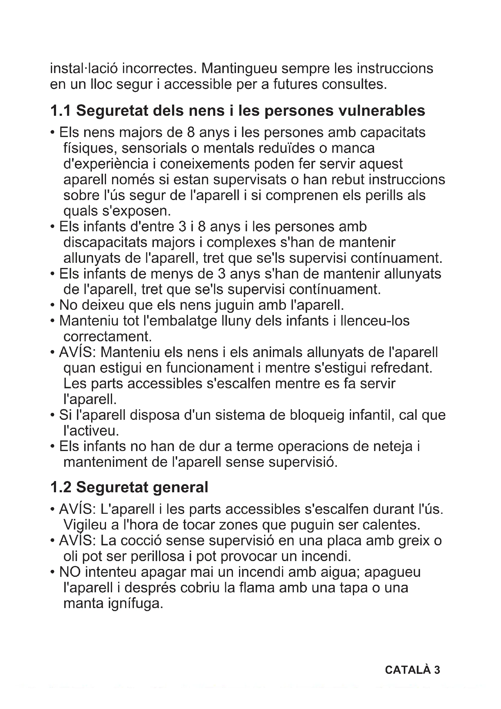 - NO intenteu apagar mai un incendi amb aigua; apagueu l'aparell i després cobriu la flama amb una tapa o una manta ignífuga. CATALÀ 3• PRECAUCIÓ: L'aparell no s'hauria de subministrar a través d'un dispositiu de commutació extern, com un temporitzador, ni connectat a un circuit que s'encengui o apagui regularment a través d'un servei públic.