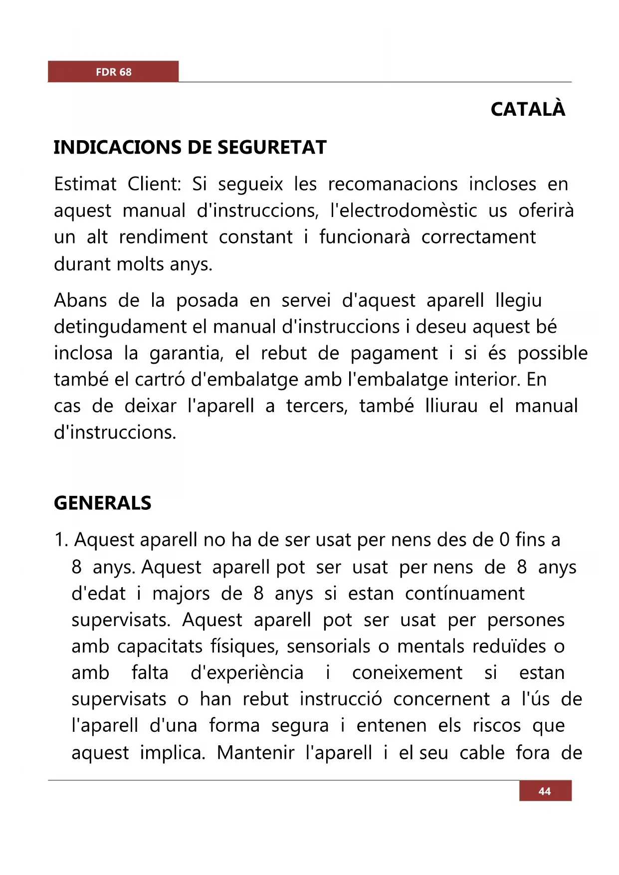 8 anys. Aquest aparell pot ser usat per nens de 8 anys d'edat i majors de 8 anys si estan contínuament supervisats. Aquest aparell pot ser usat per persones amb capacitats físiques, sensorials o mentals reduïdes o amb falta d'experiència i coneixement si estan supervisats o han rebut instrucció concernent a l'ús de l'aparell d'una forma segura i entenen els riscos que aquest implica. Mantenir l'aparell i el seu cable fora deFDR 68