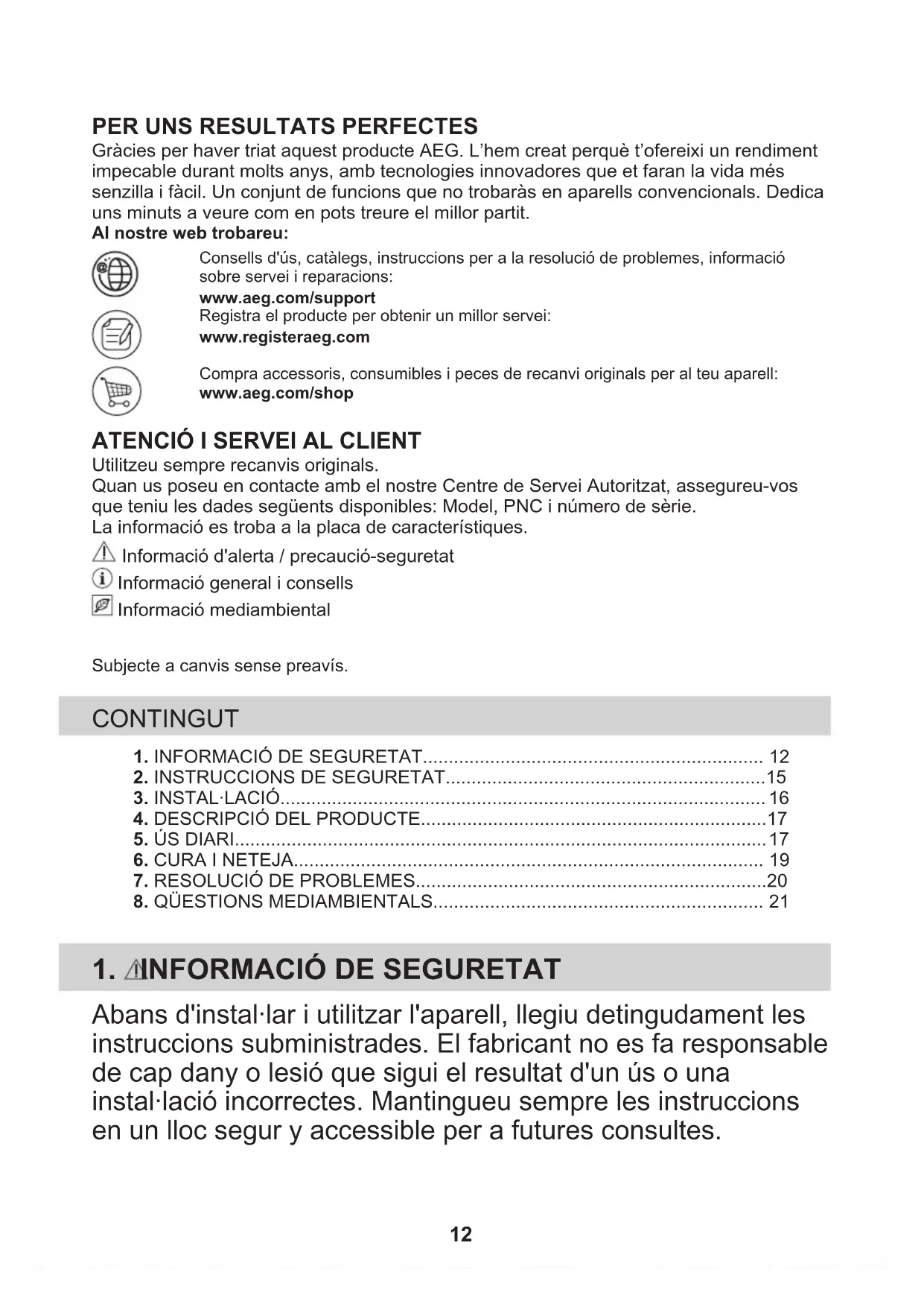 Gràcies per haver triat aquest producte AEG. L’hem creat perquè t’ofereixi un rendimentimpecable durant molts anys, amb tecnologies innovadores que et faran la vida méssenzilla i fàcil. Un conjunt de funcions que no trobaràs en aparells convencionals. Dedicauns minuts a veure com en pots treure el millor partit.Al nostre web trobareu:Consells d'ús, catàlegs, instruccions per a la resolució de problemes, informaciósobre servei i reparacions:www.aeg.com/supportRegistra el producte per obtenir un millor servei:www.registeraeg.comCompra accessoris, consumibles i peces de recanvi originals per al teu aparell:www.aeg.com/shop